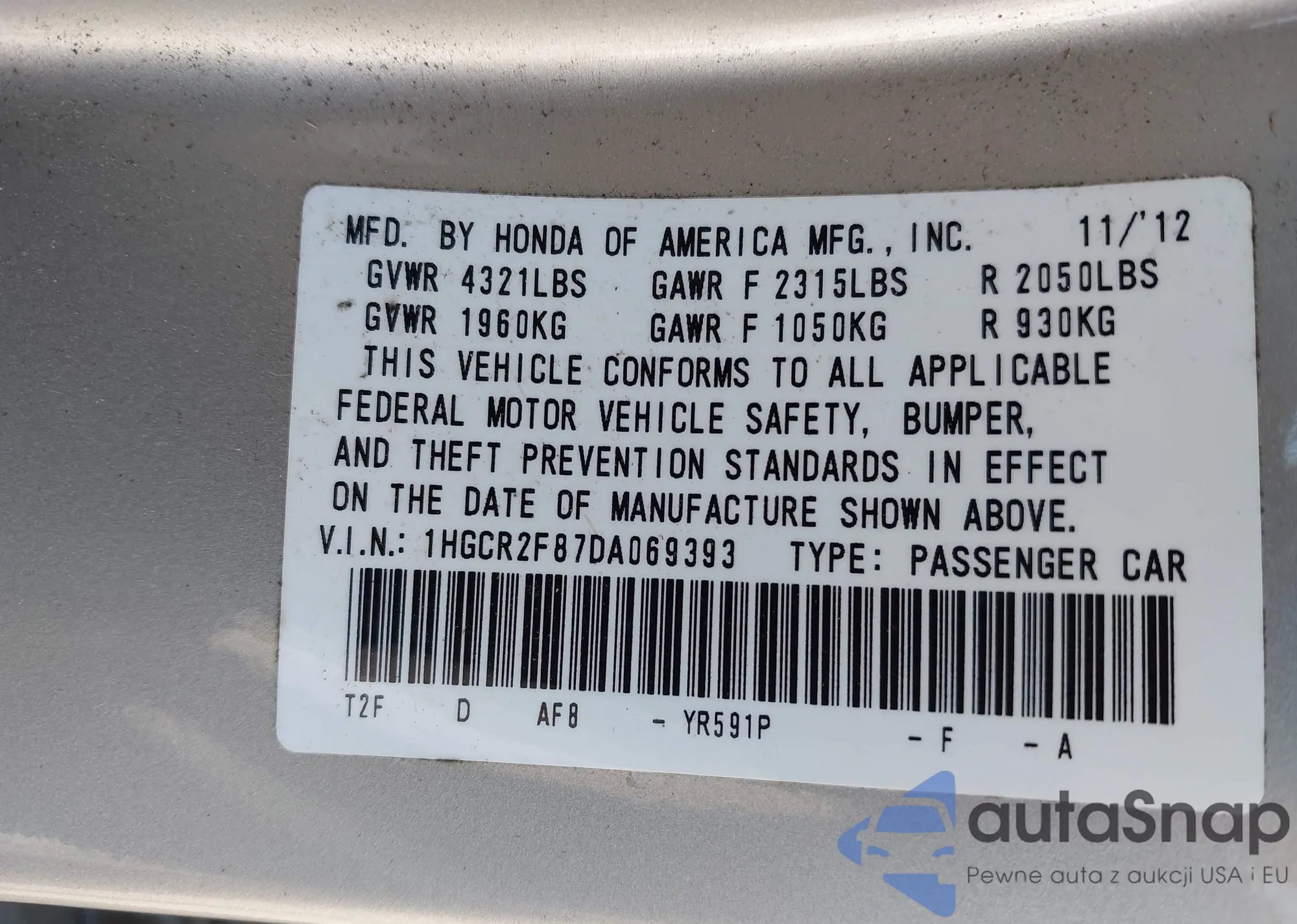 • VIN 1HGCR2F87DA069393