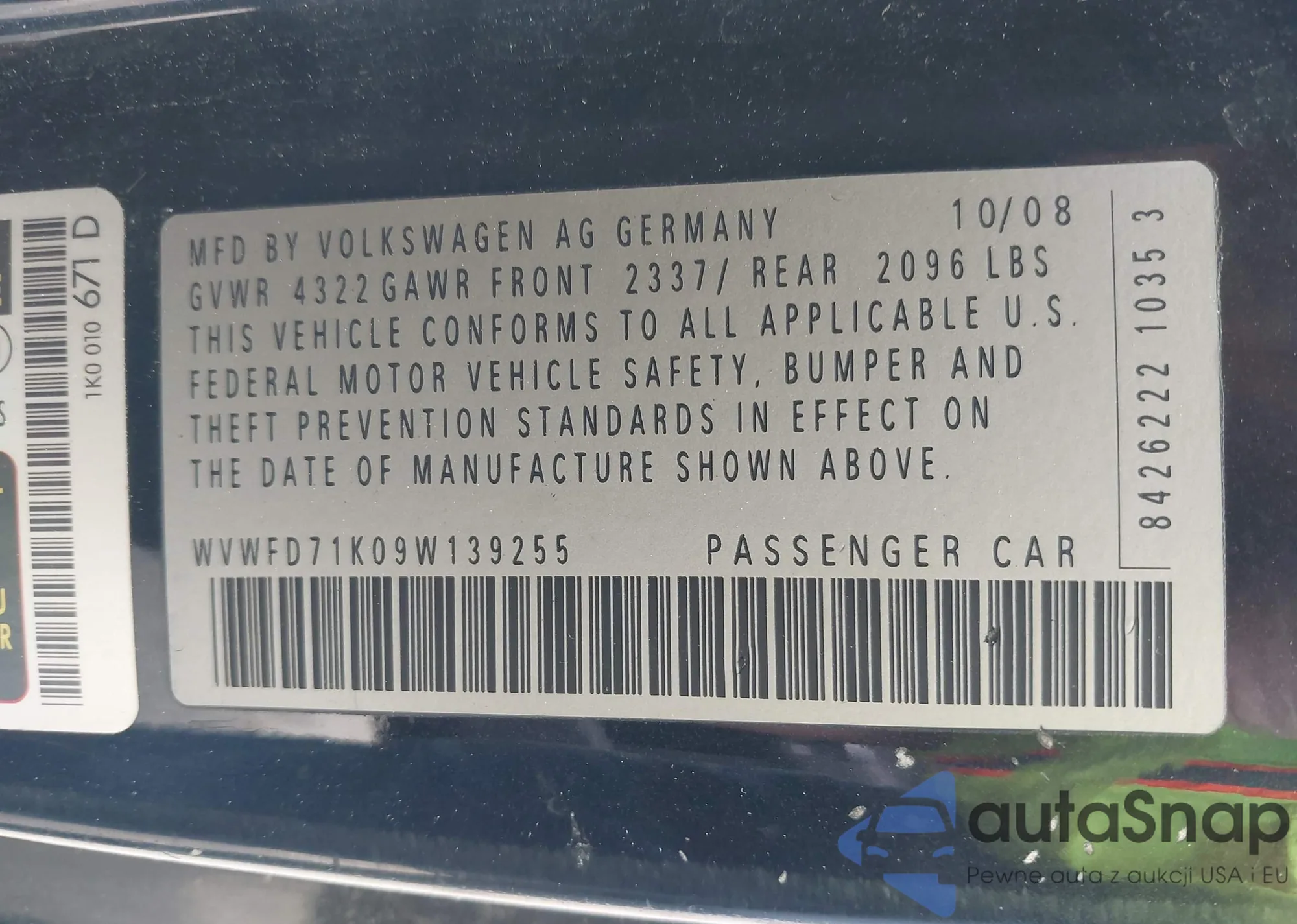 LOT: 42411825 VIN: WVWFD71K09W139255