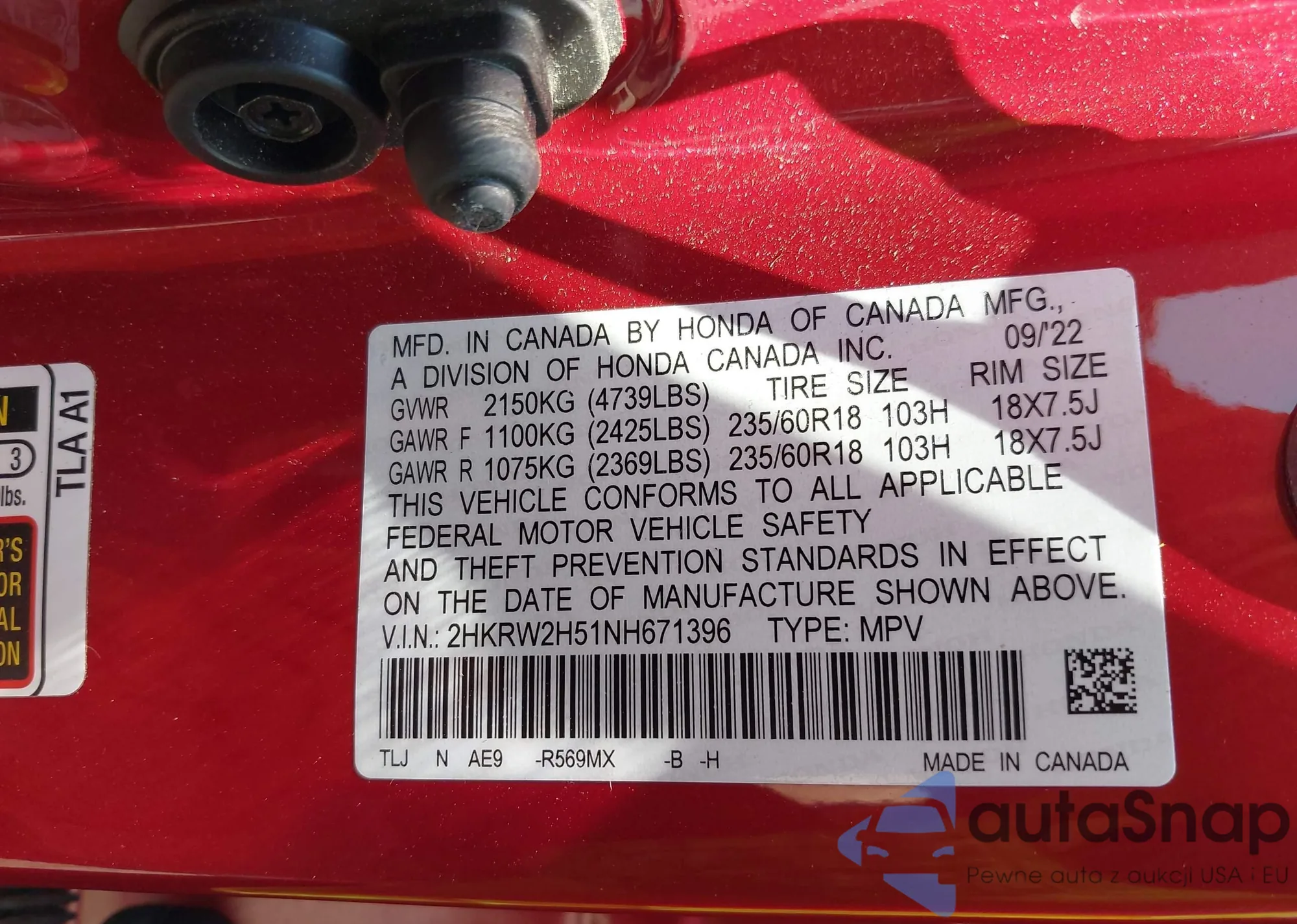 • VIN 2HKRW2H51NH671396