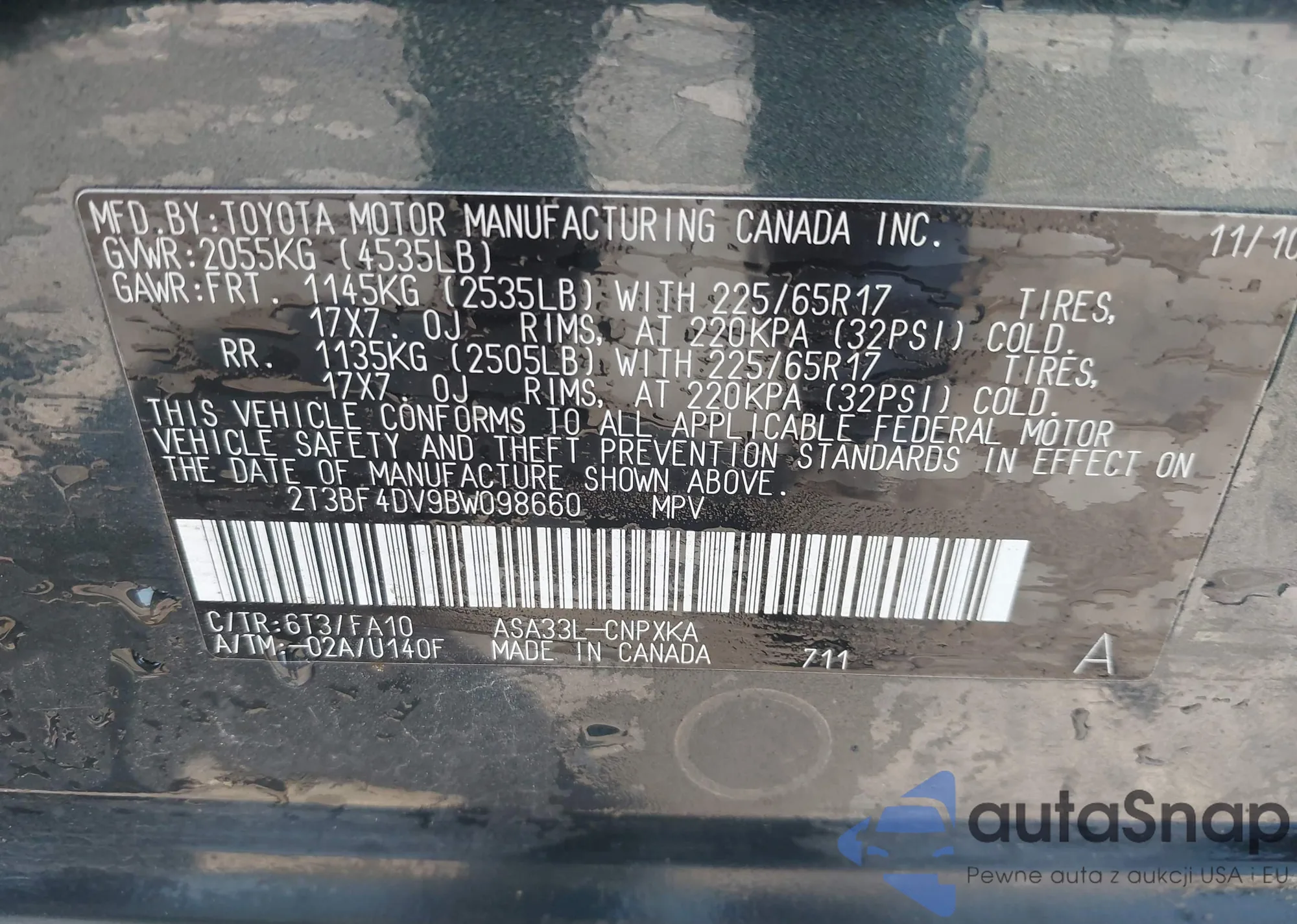 LOT: 42548816 VIN: 2T3BF4DV9BW098660