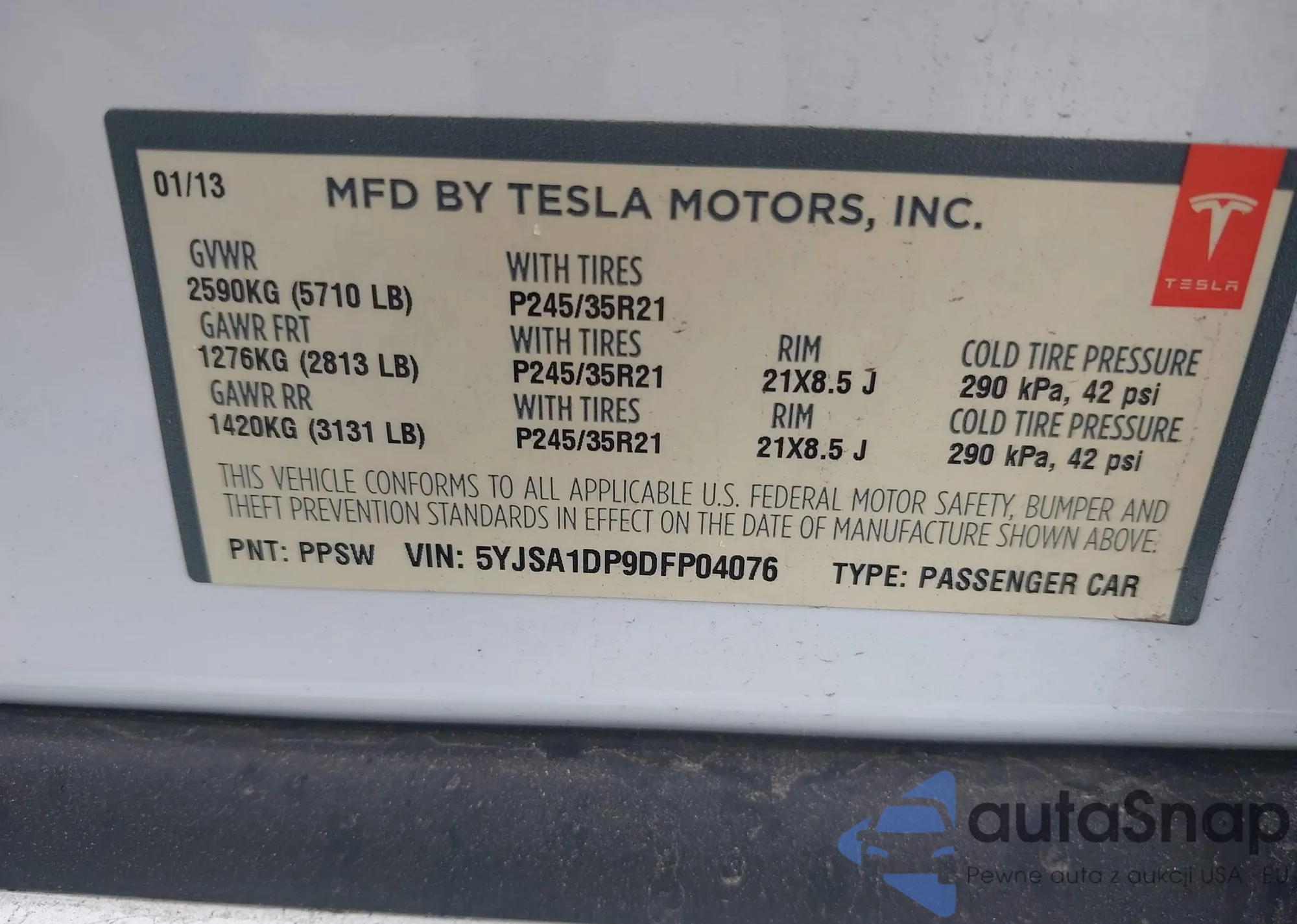 LOT: 42185465 VIN: 5YJSA1DP9DFP04076