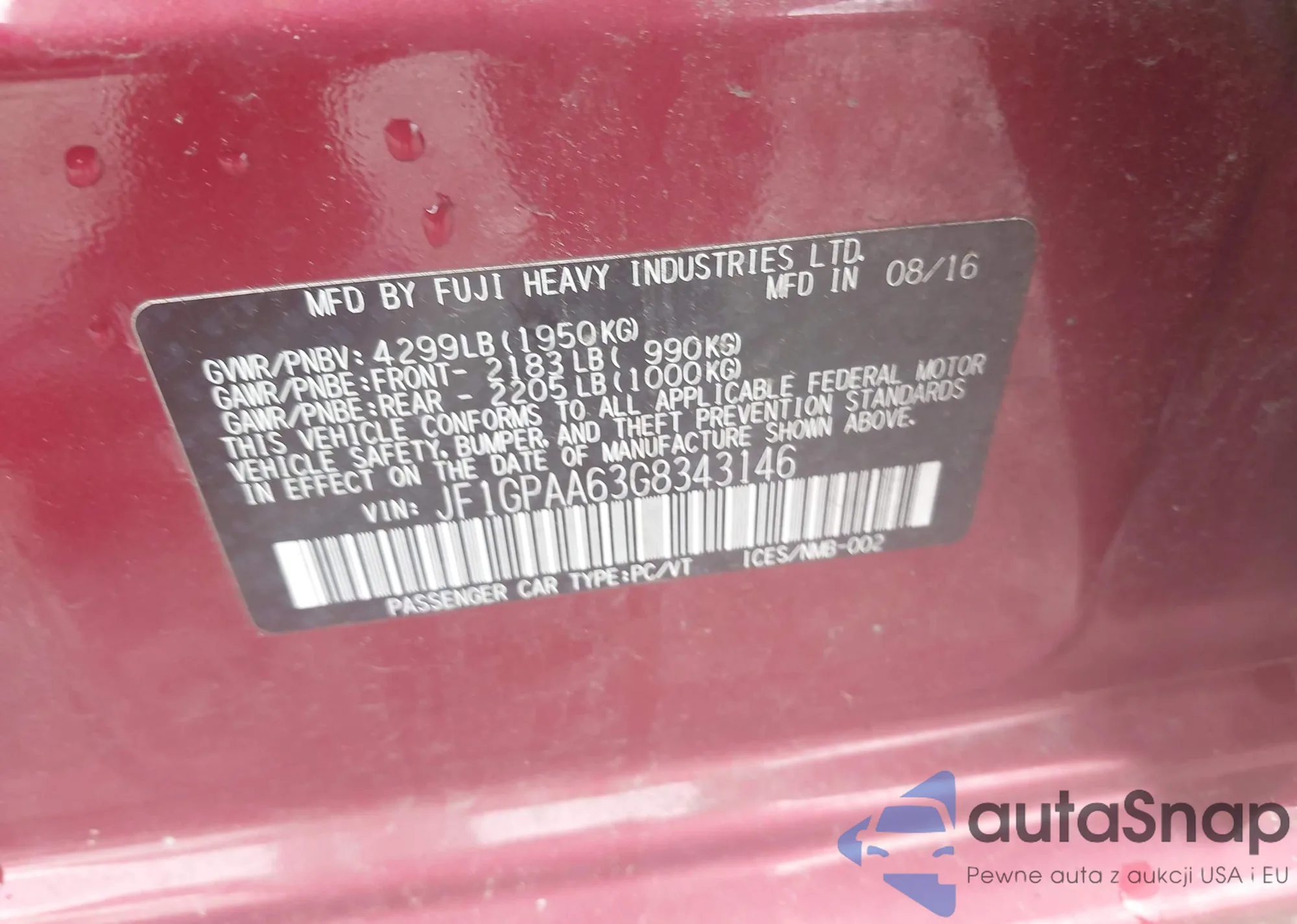 LOT: 42472567 VIN: JF2GPAKC3GH337508