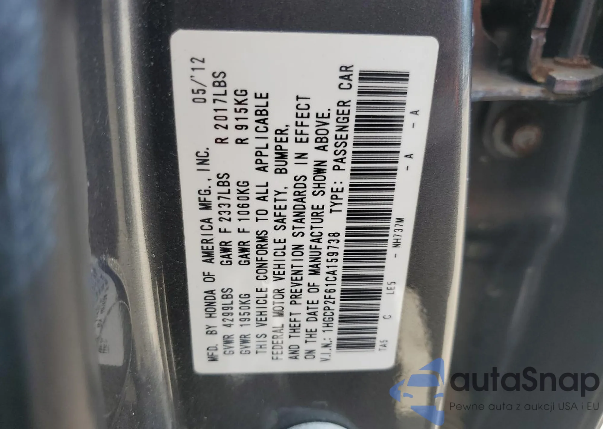 LOT: 62695295 VIN: 1HGCP2F61CA159738