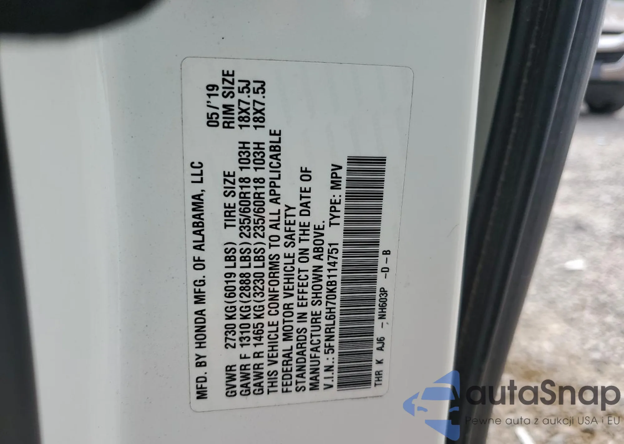 • VIN 5FNRL6H70KB114751