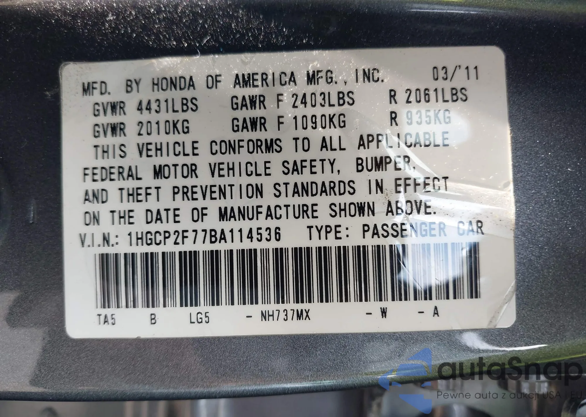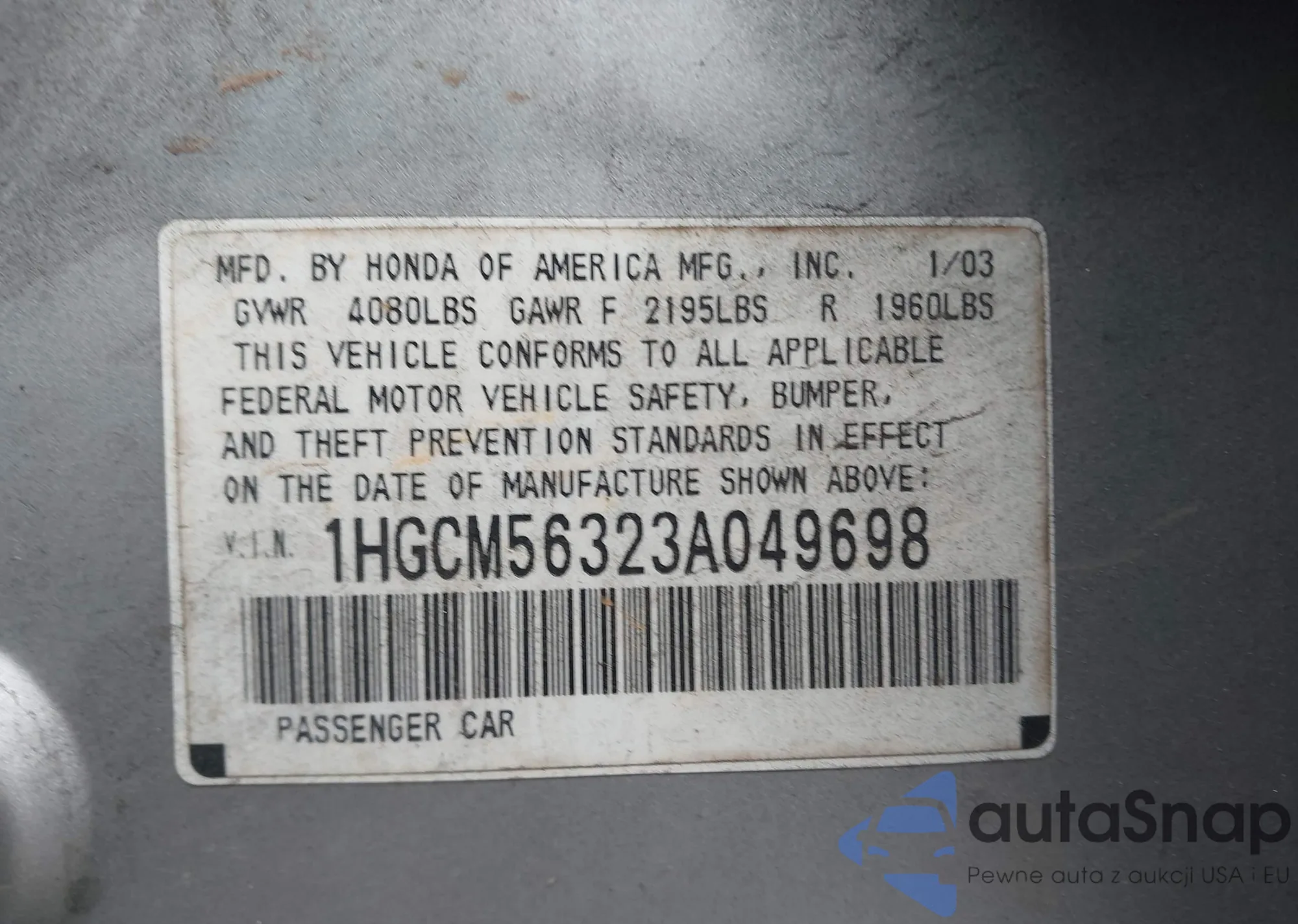 LOT: 41995815 VIN: 1HGCM66577A081558