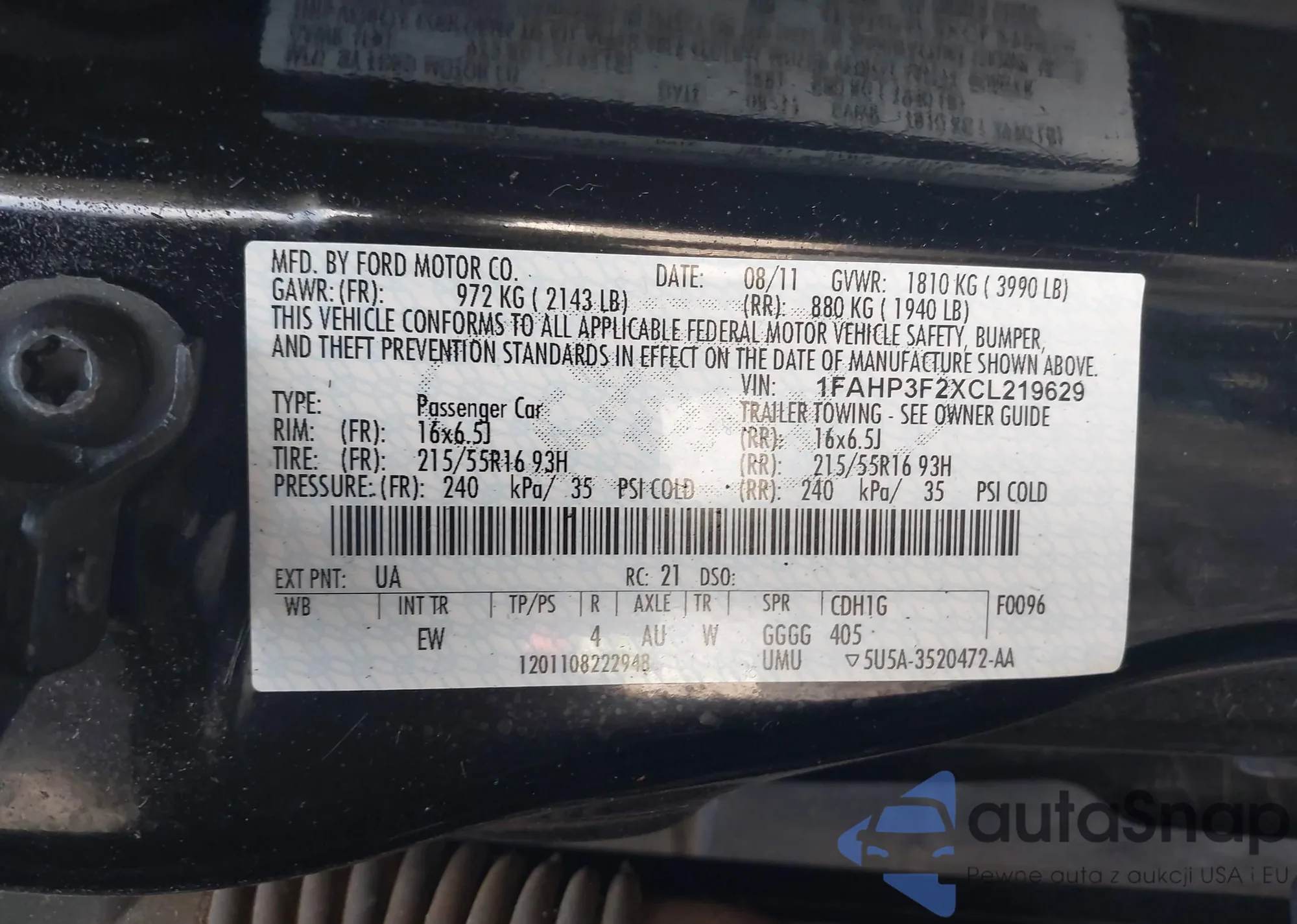 • VIN 1FAHP3F2XCL219629