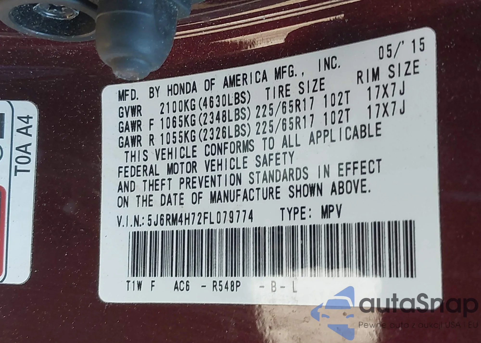 • VIN 5J6RM4H72FL079774