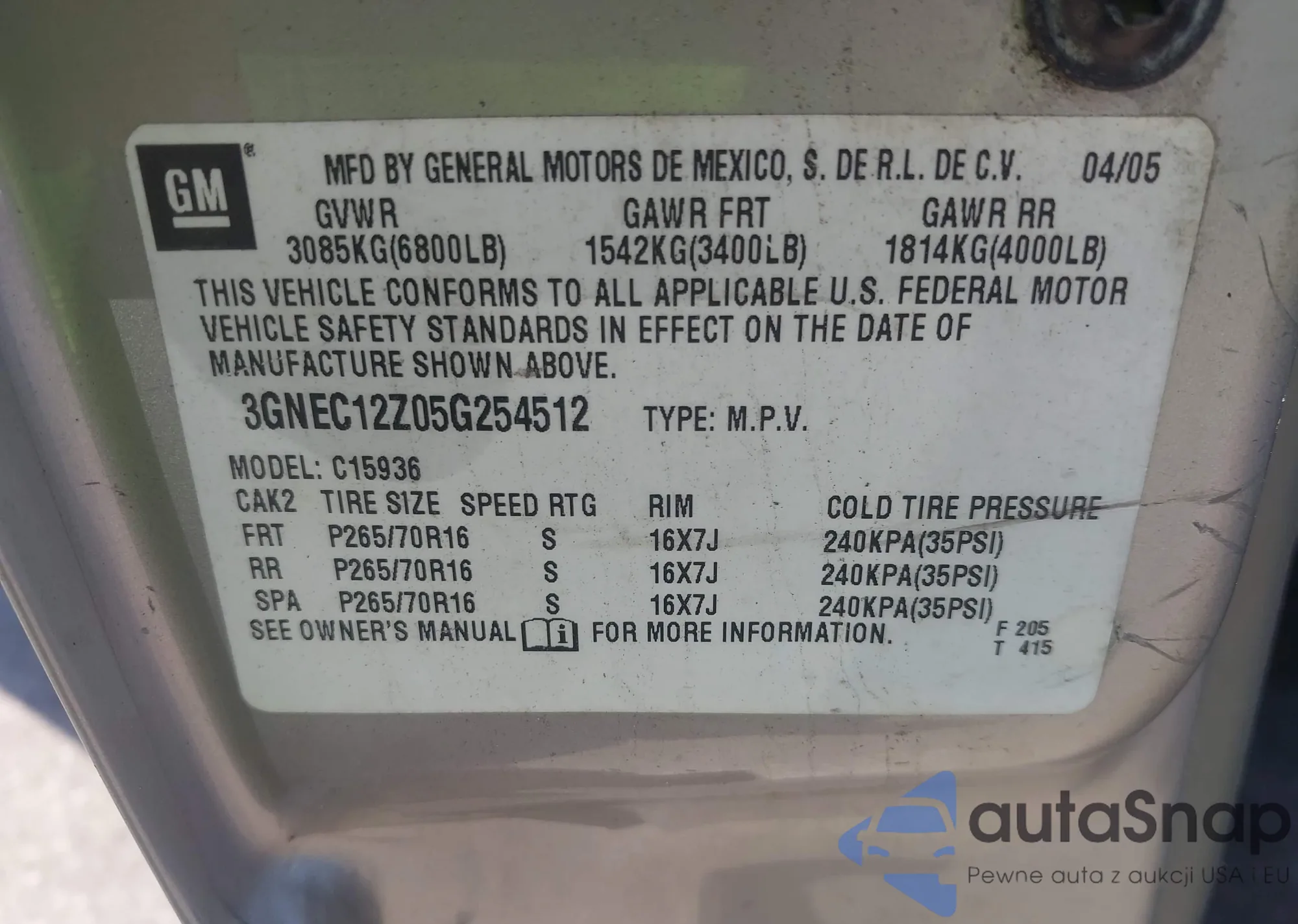 • VIN 3GNEC12Z05G254512