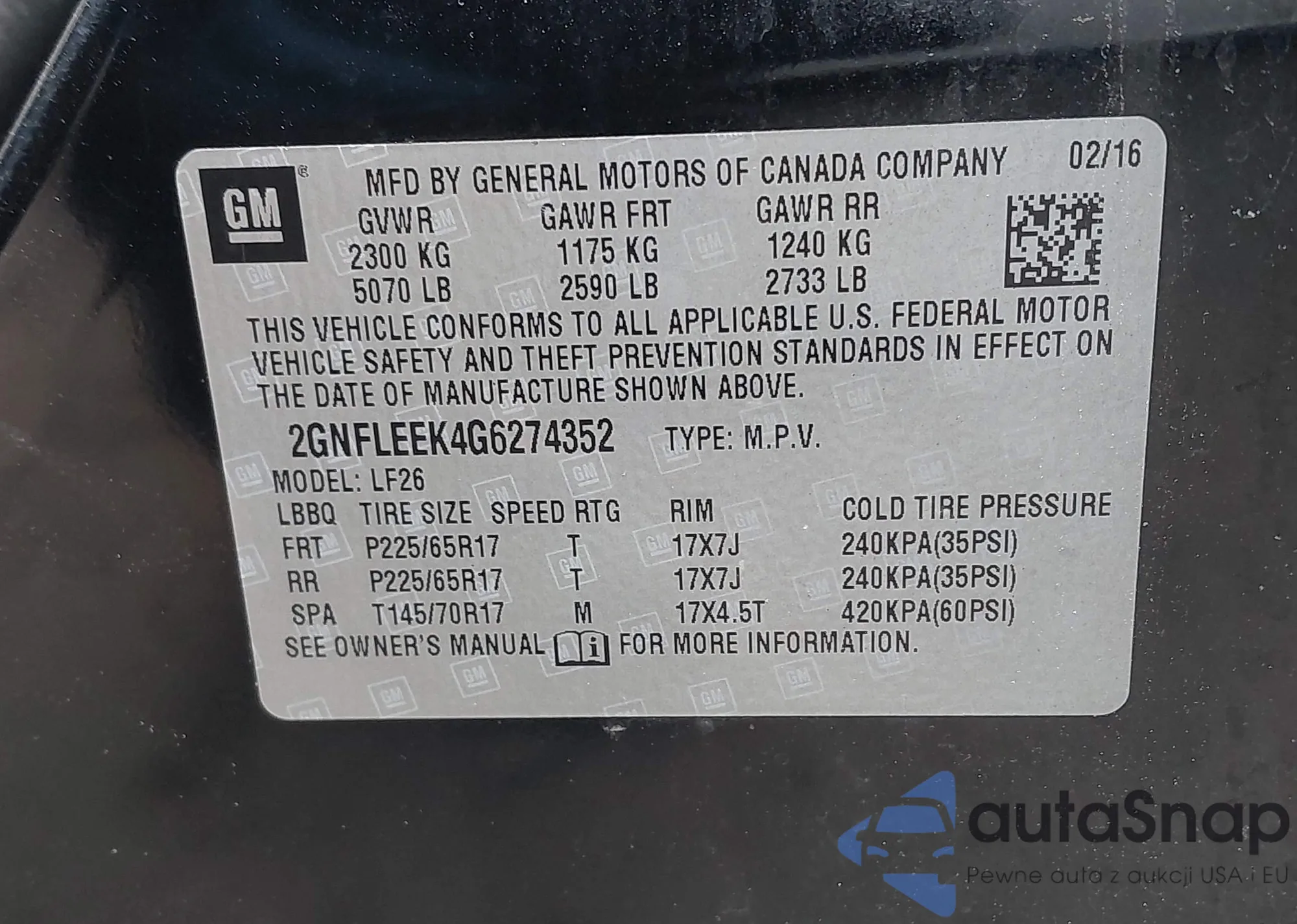 LOT: 42493603 VIN: 2CKDL63F376063535