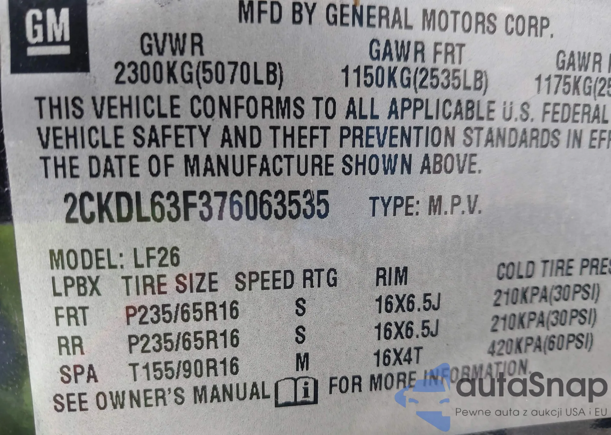 • VIN 2CKDL63F376063535