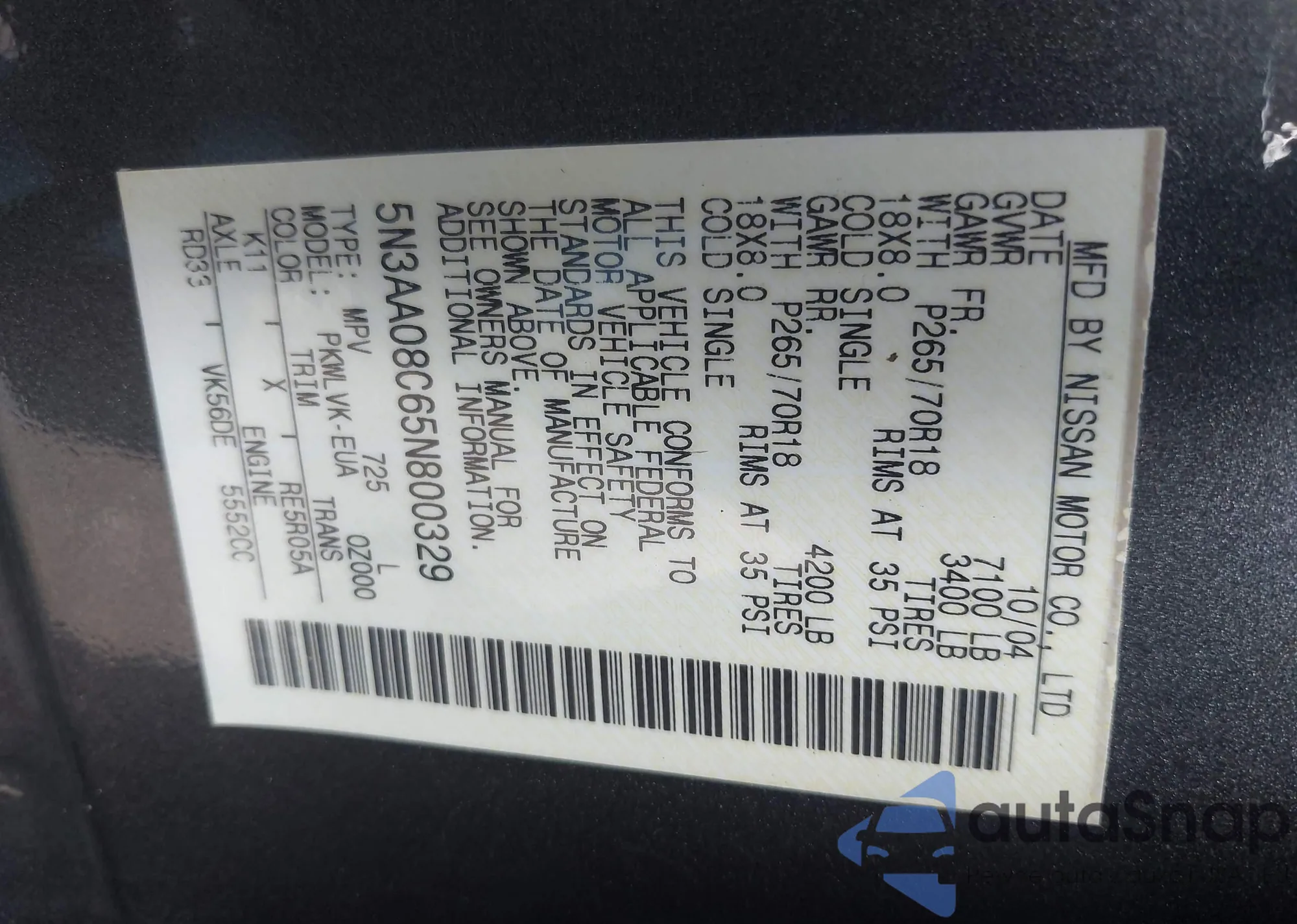 • VIN 5N3AA08C65N800329