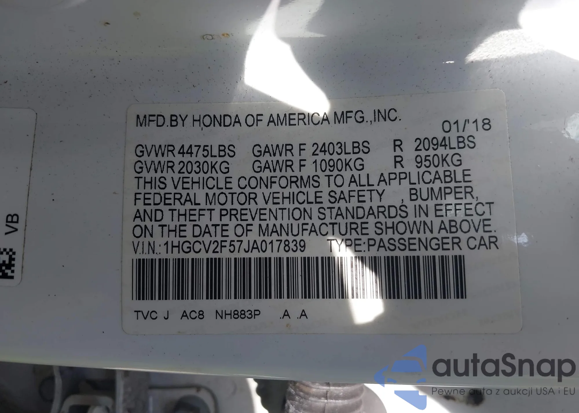 LOT: 42301610 VIN: 1HGCP36838A042337
