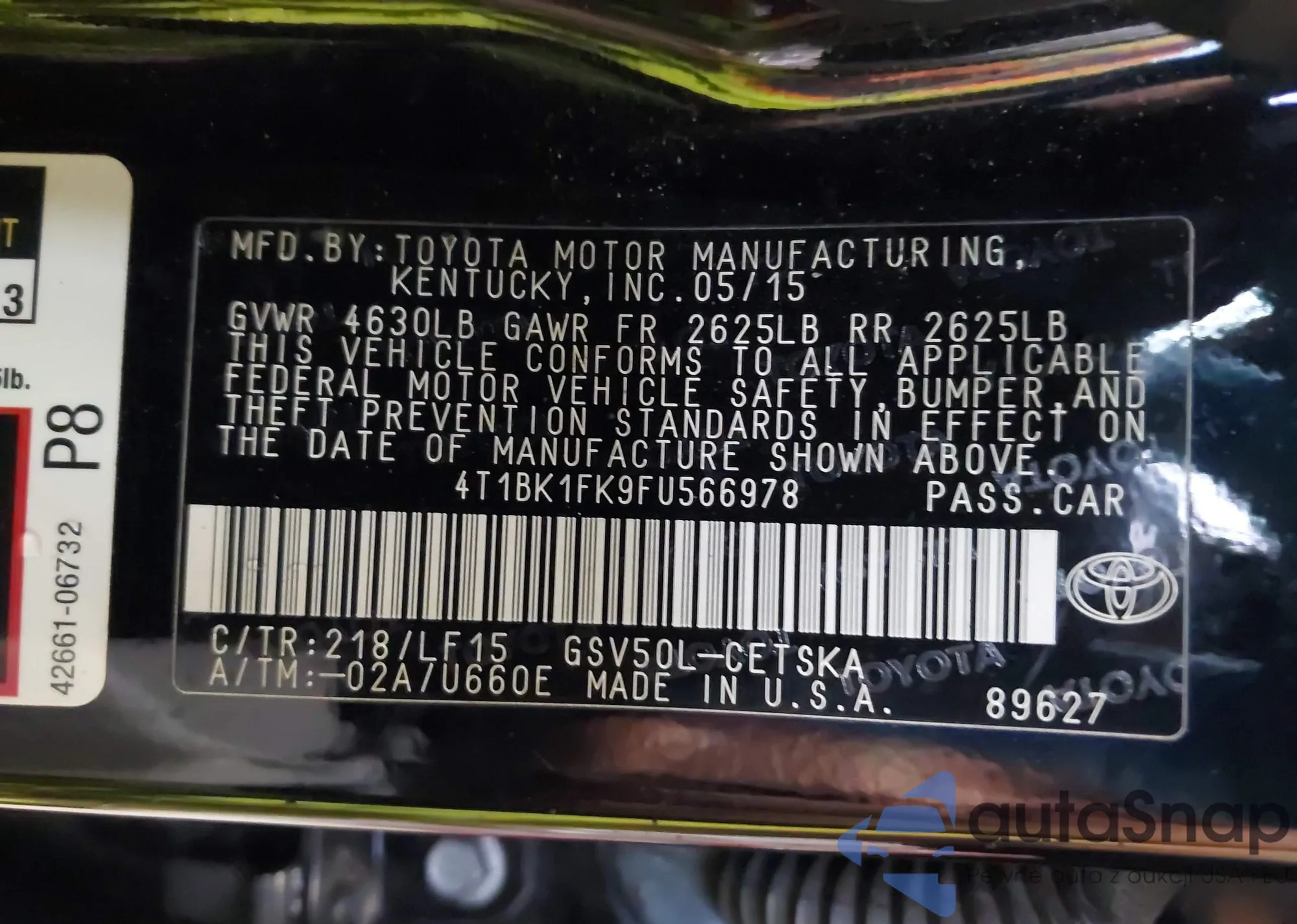 LOT: 42311085 VIN: 4T1BK1FK9FU566978