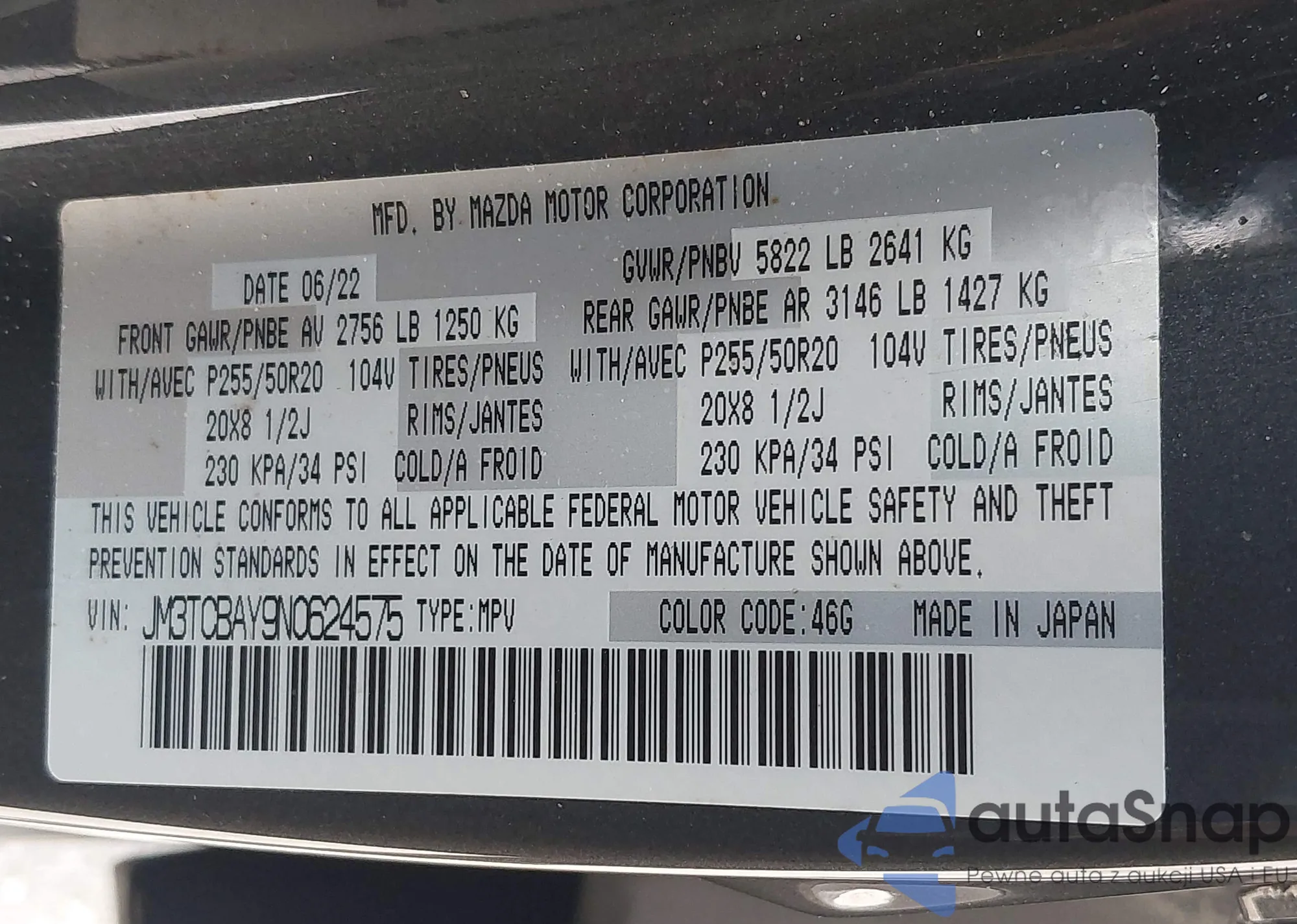 LOT: 42326284 VIN: JM3TCBAY9N0624575