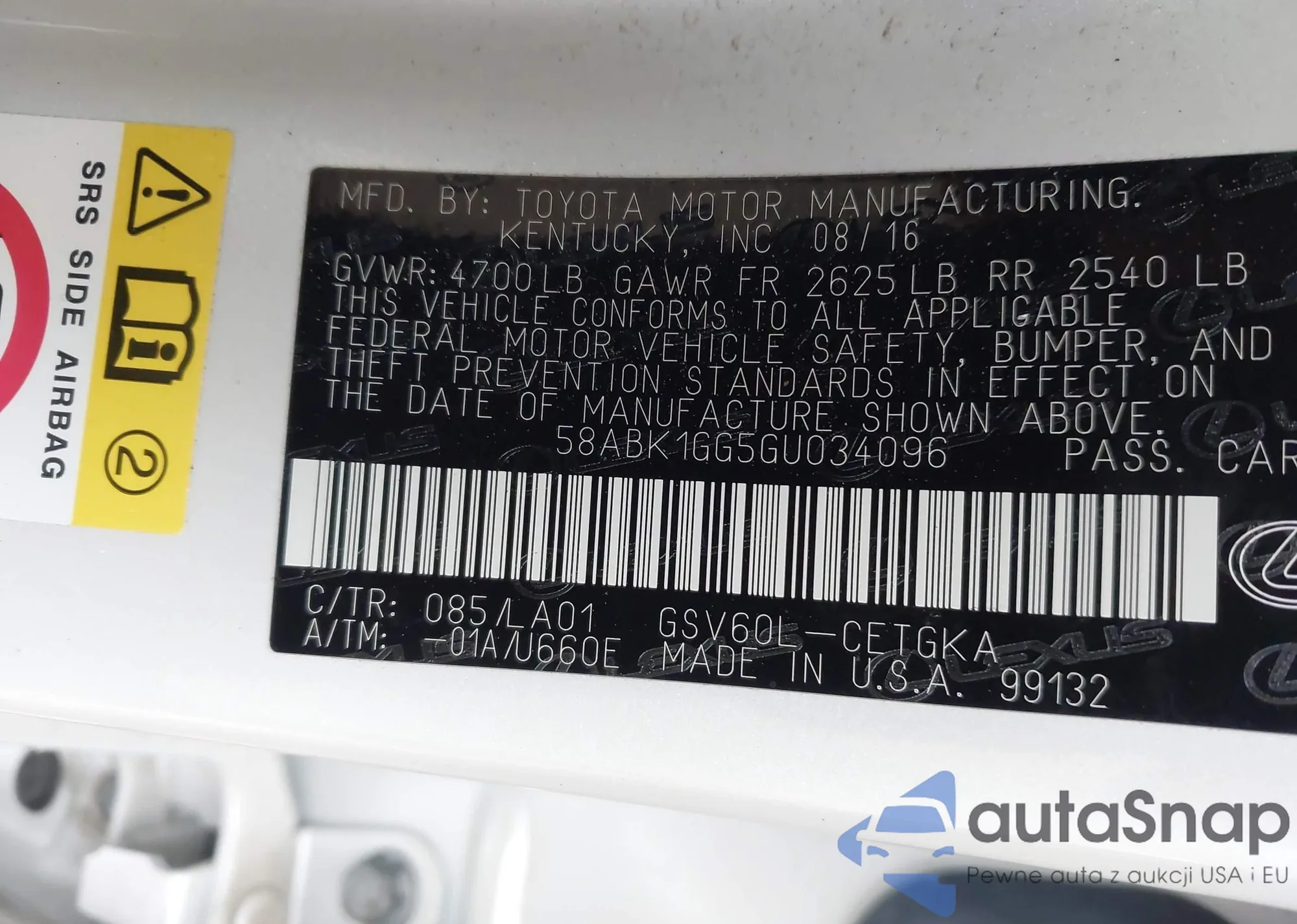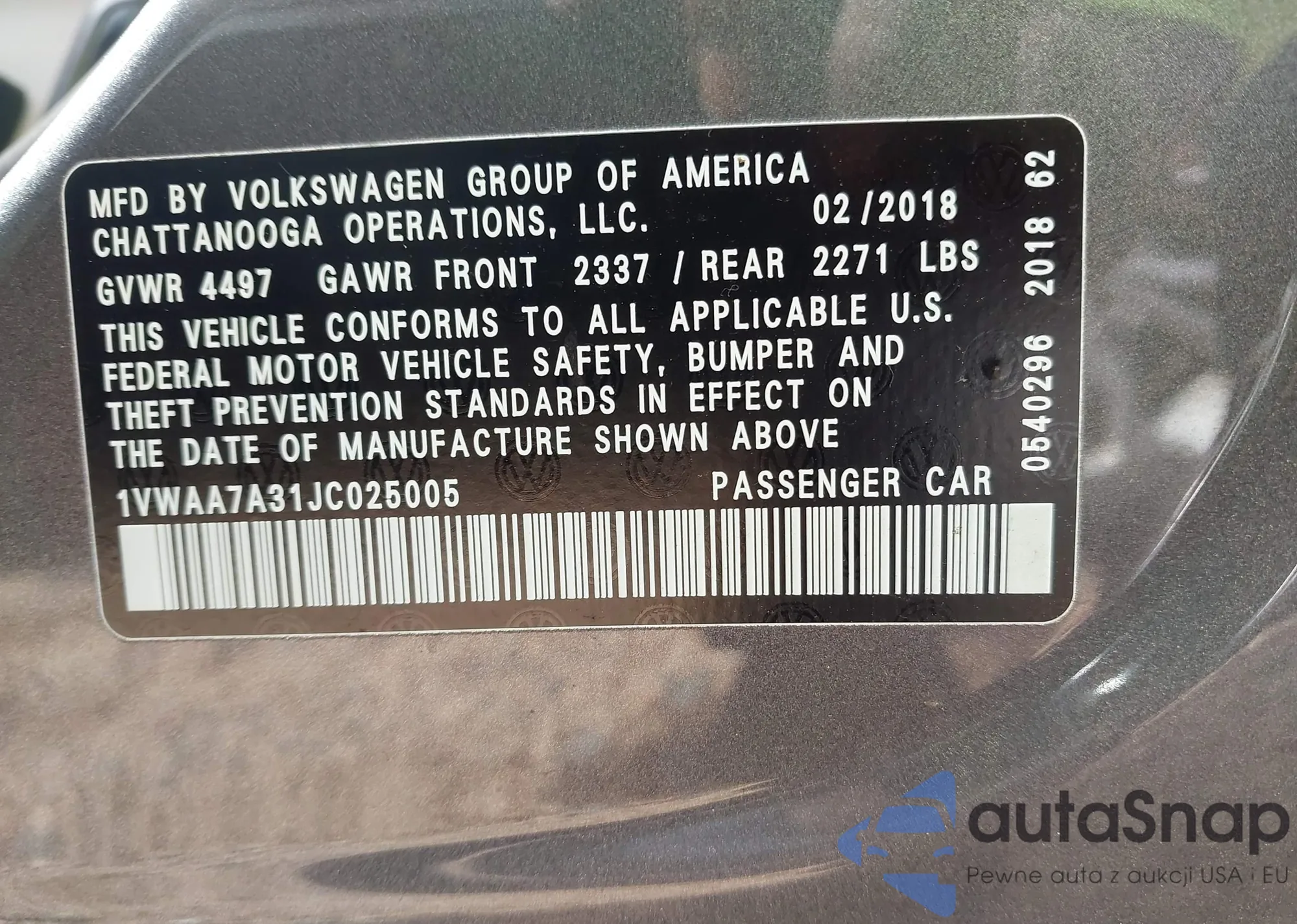 LOT: 42287796 VIN: 1VWAA7A31JC025005