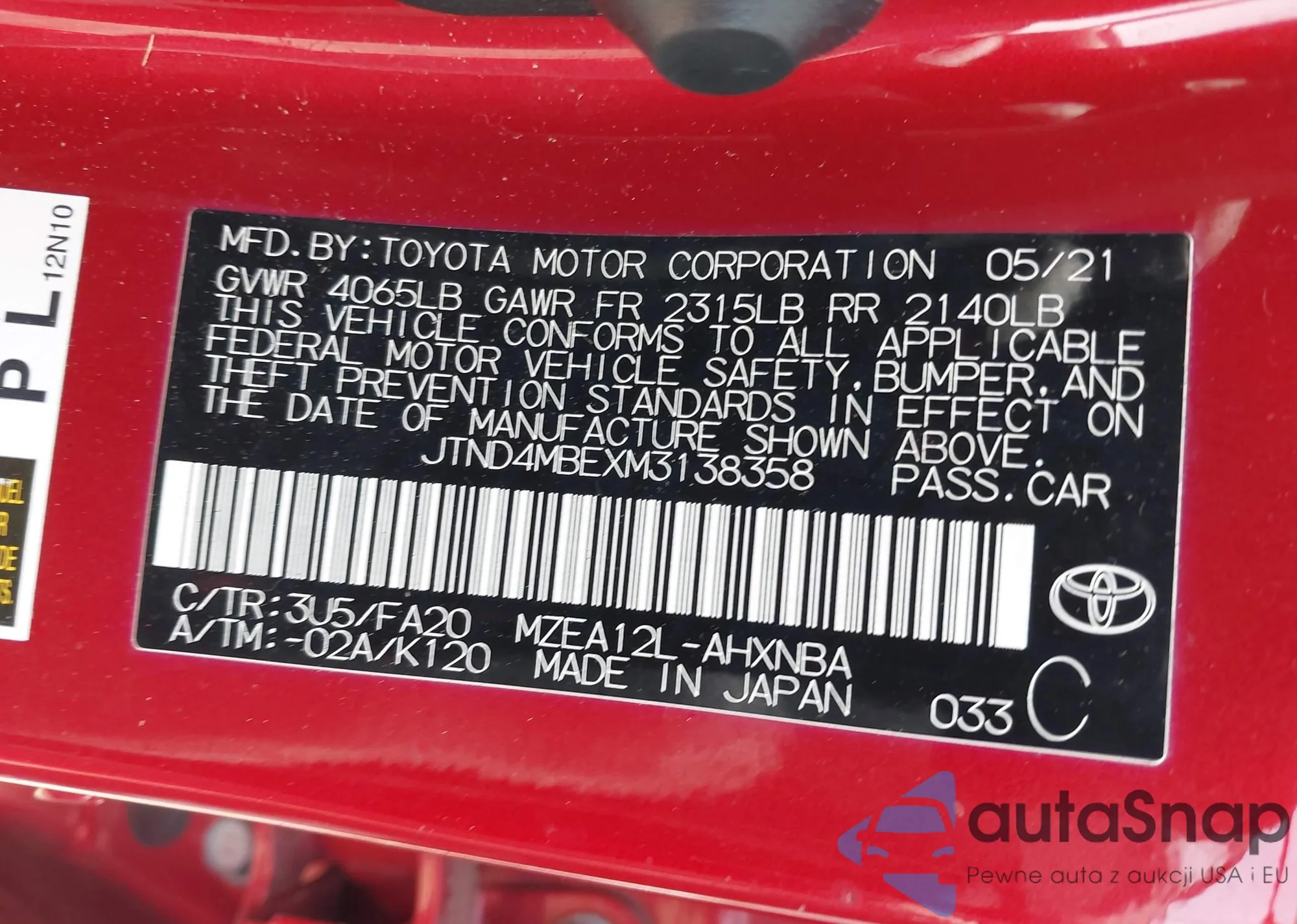 LOT: 42388199 VIN: JTND4MBEXM3138358