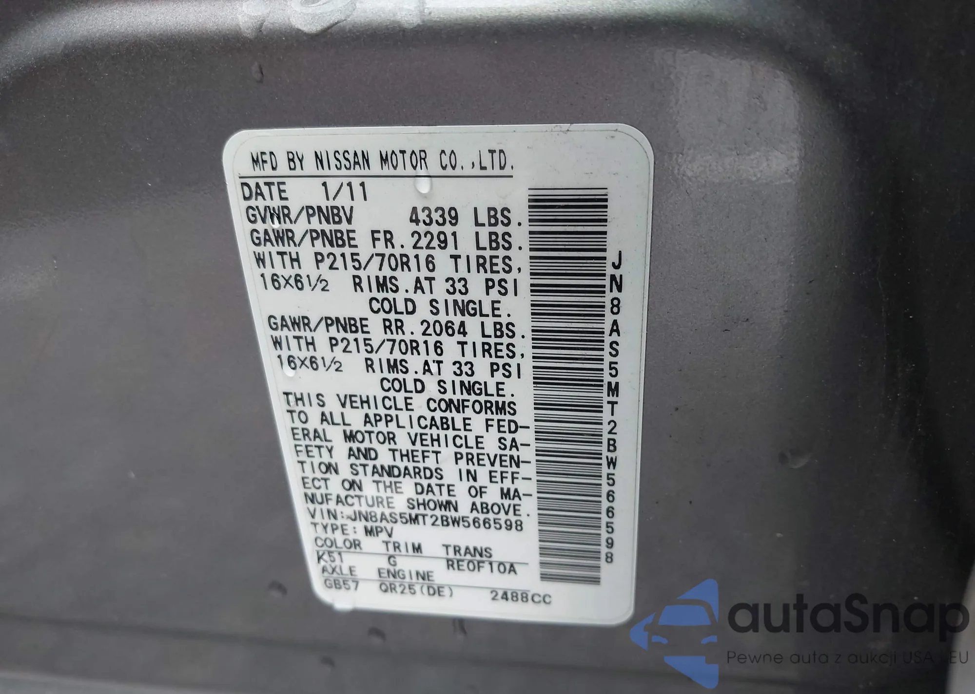• VIN JN8AS5MT2BW566598