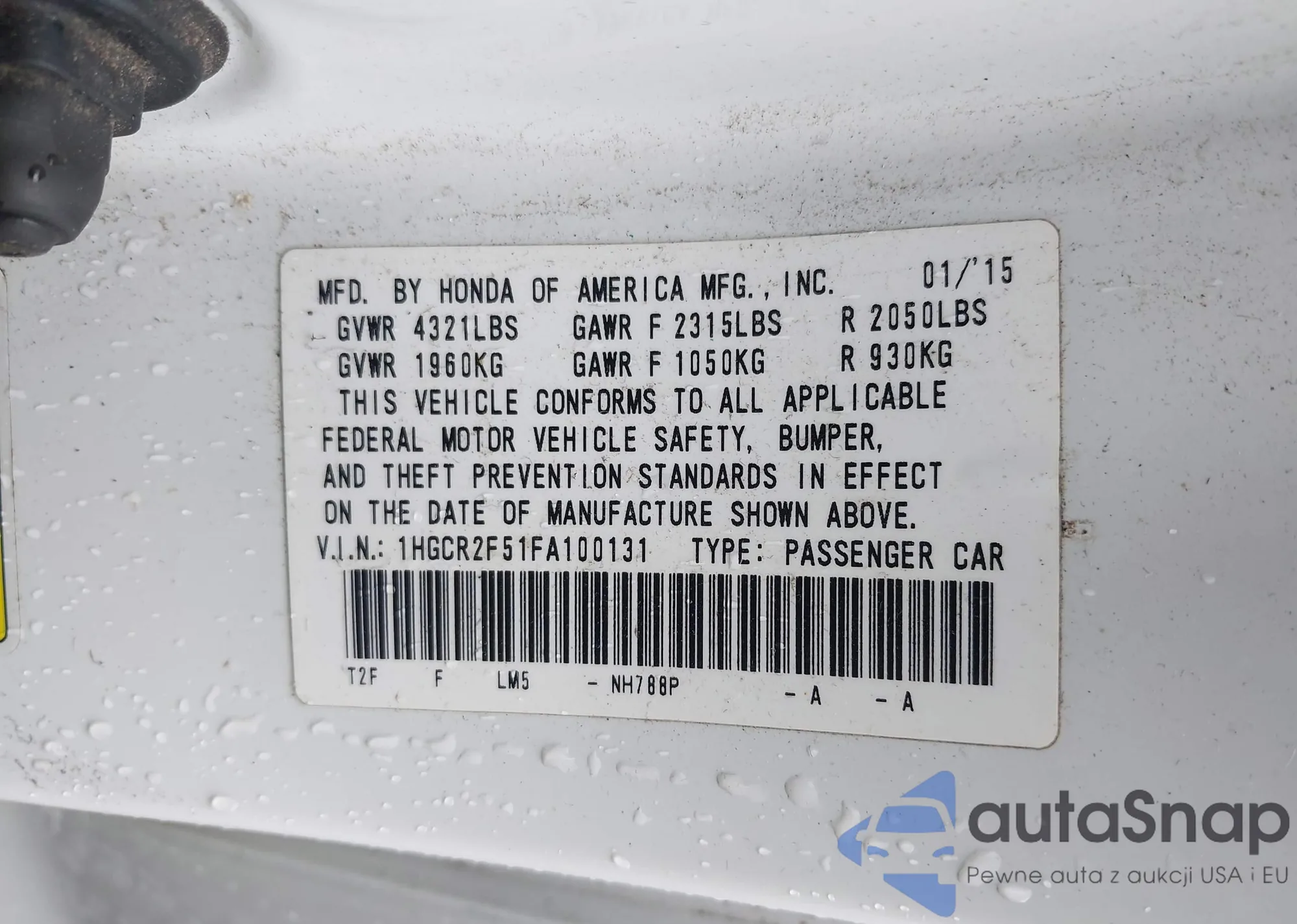 LOT: 42464781 VIN: 1HGCR2F51FA100131