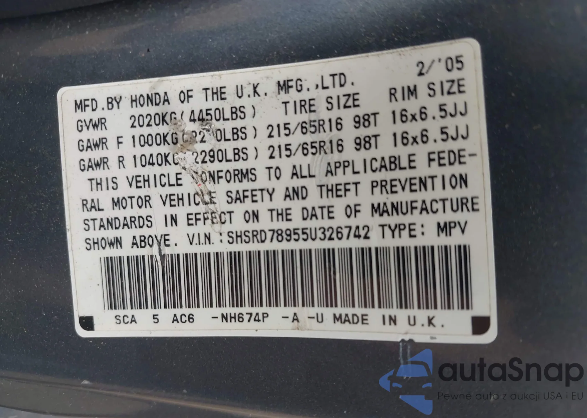 LOT: 42613472 VIN: SHSRD78955U326742