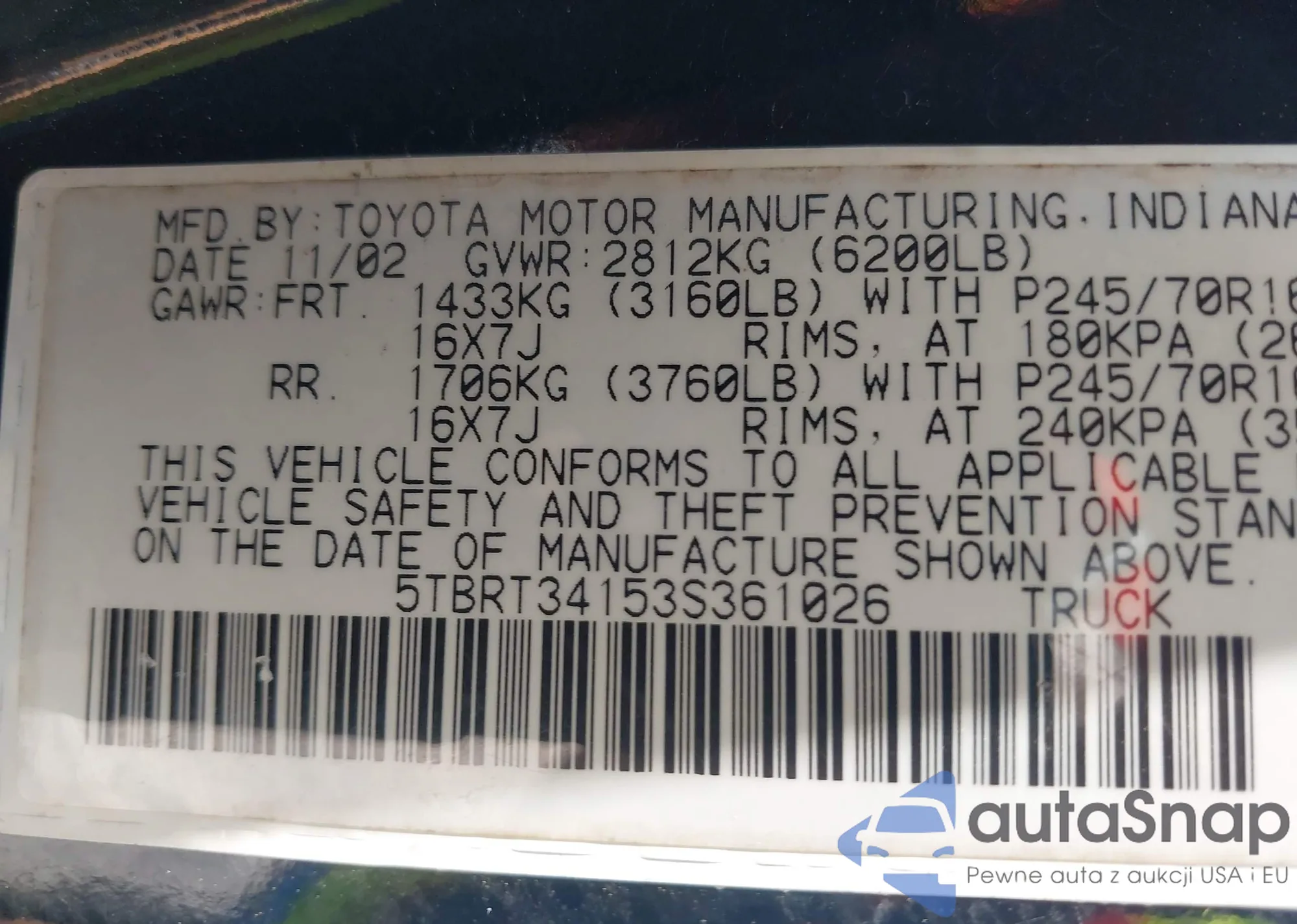 LOT: 42630068 VIN: 5TBRT34153S361026