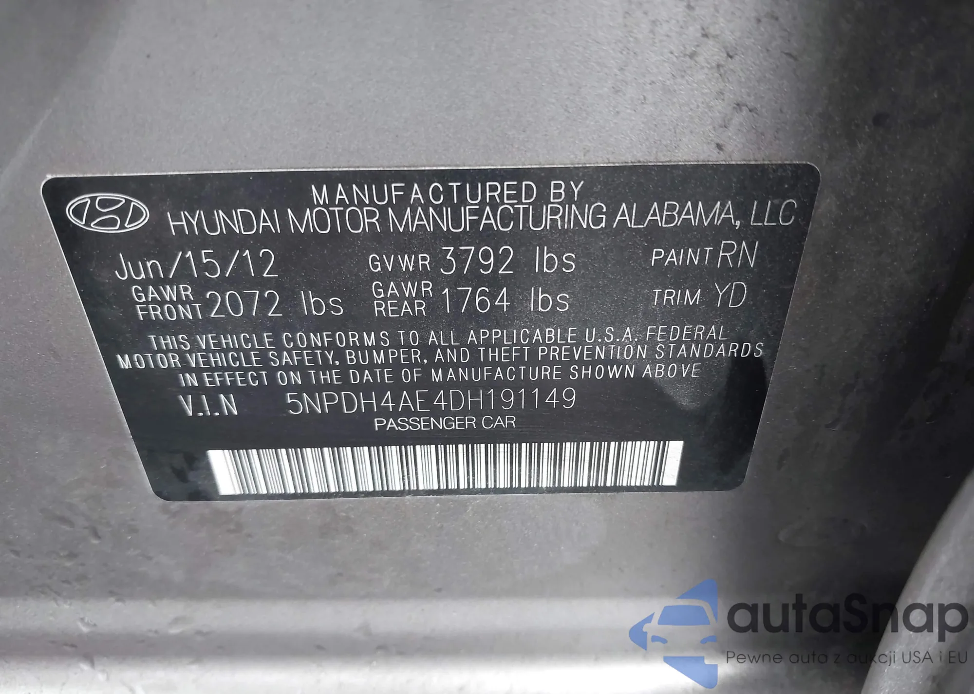 • VIN 5NPDH4AE4DH191149