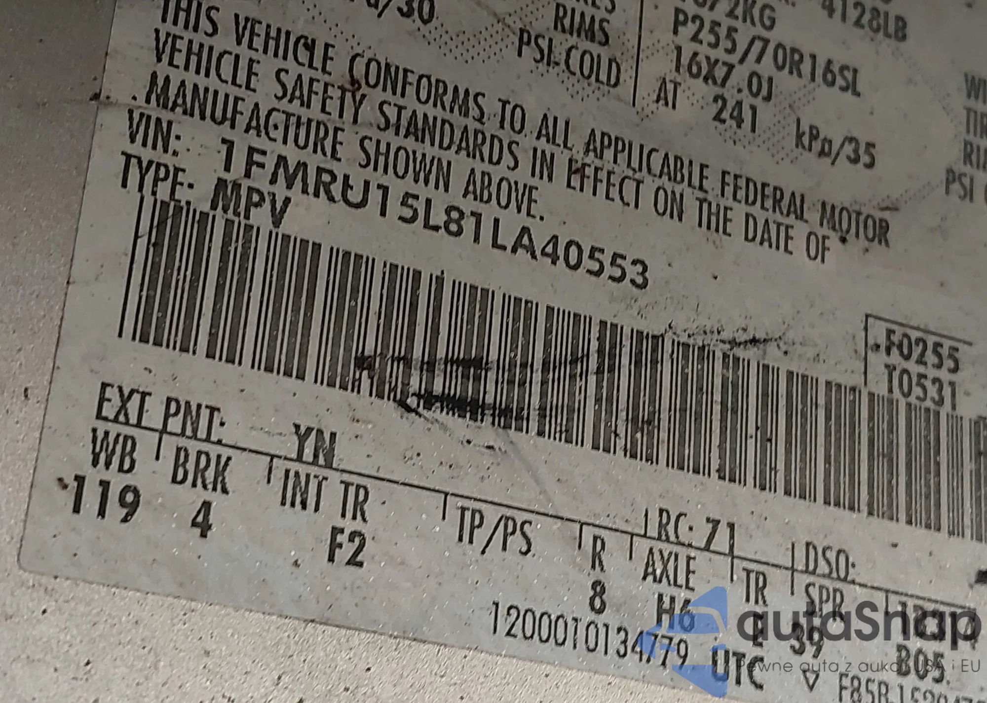 LOT: 42381592 VIN: 1FMRU15L81LA40553