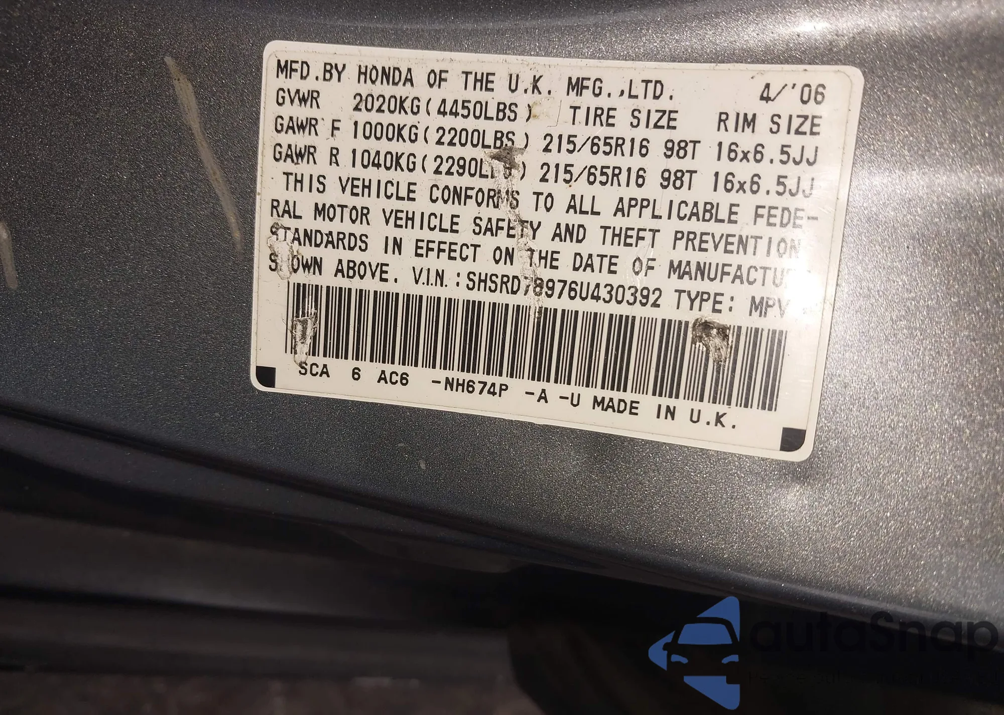 • VIN SHSRD78976U430392