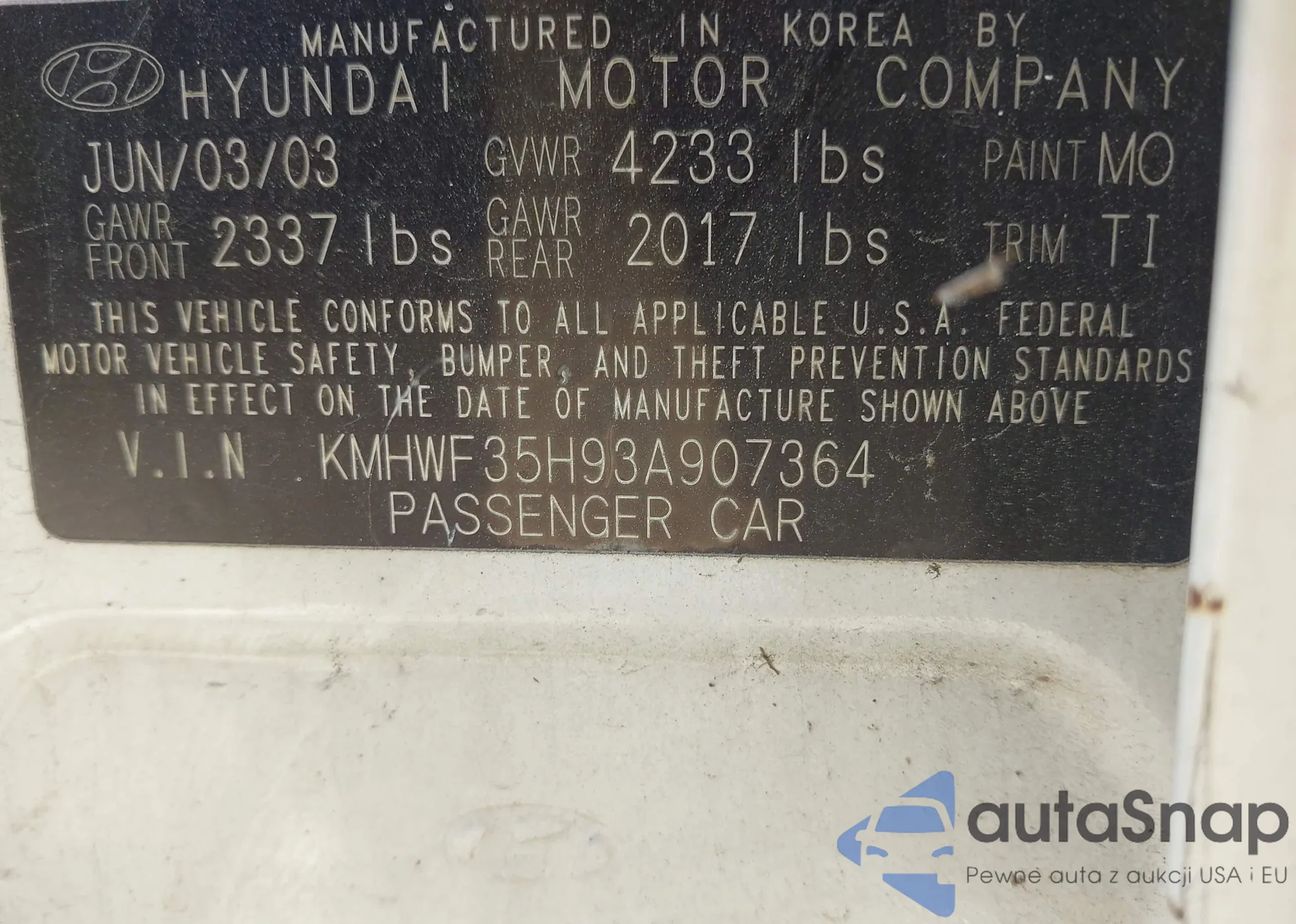 LOT: 42572311 VIN: KMHWF35H93A907364