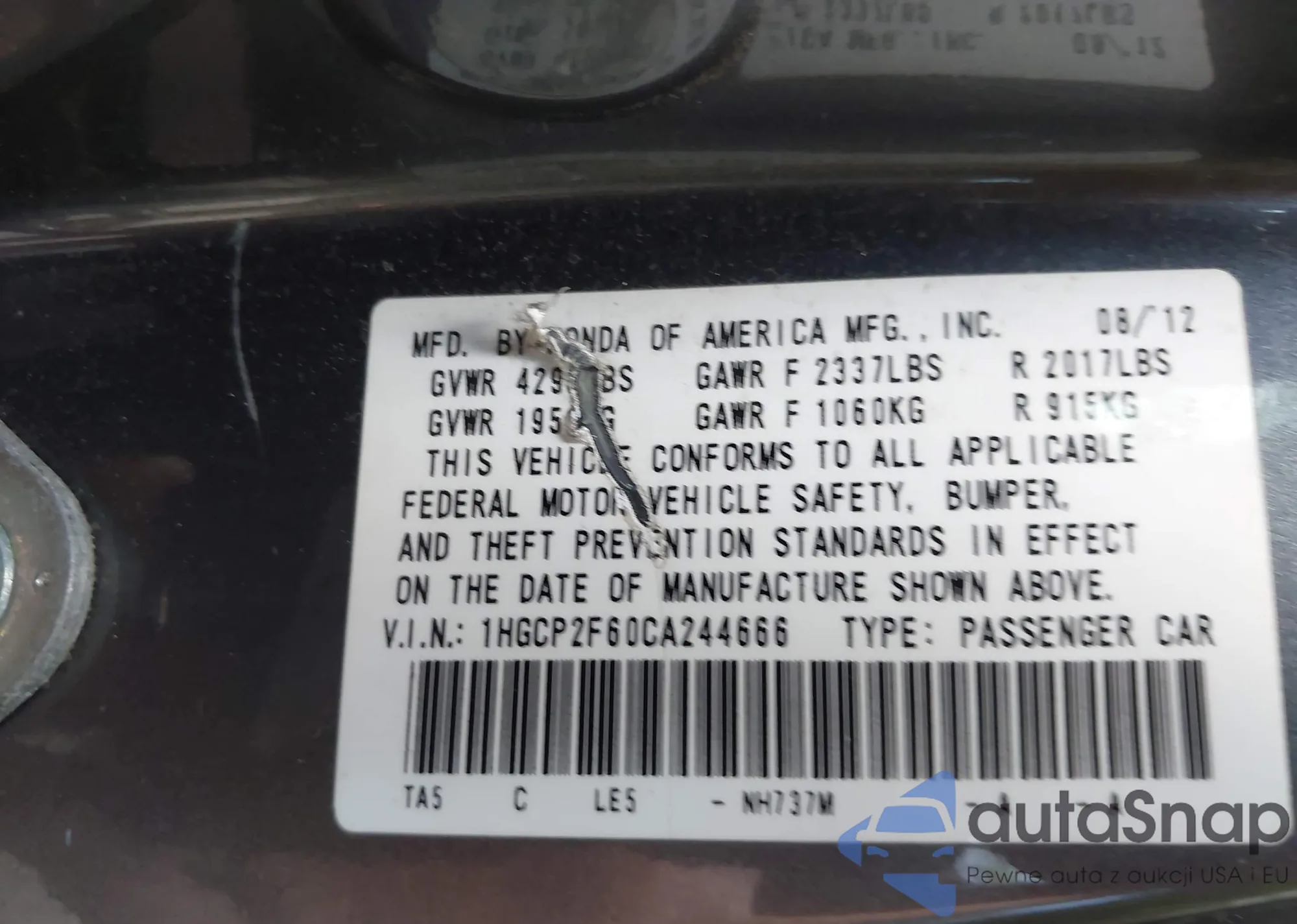 LOT: 42623904 VIN: 1HGCP2F60CA244666