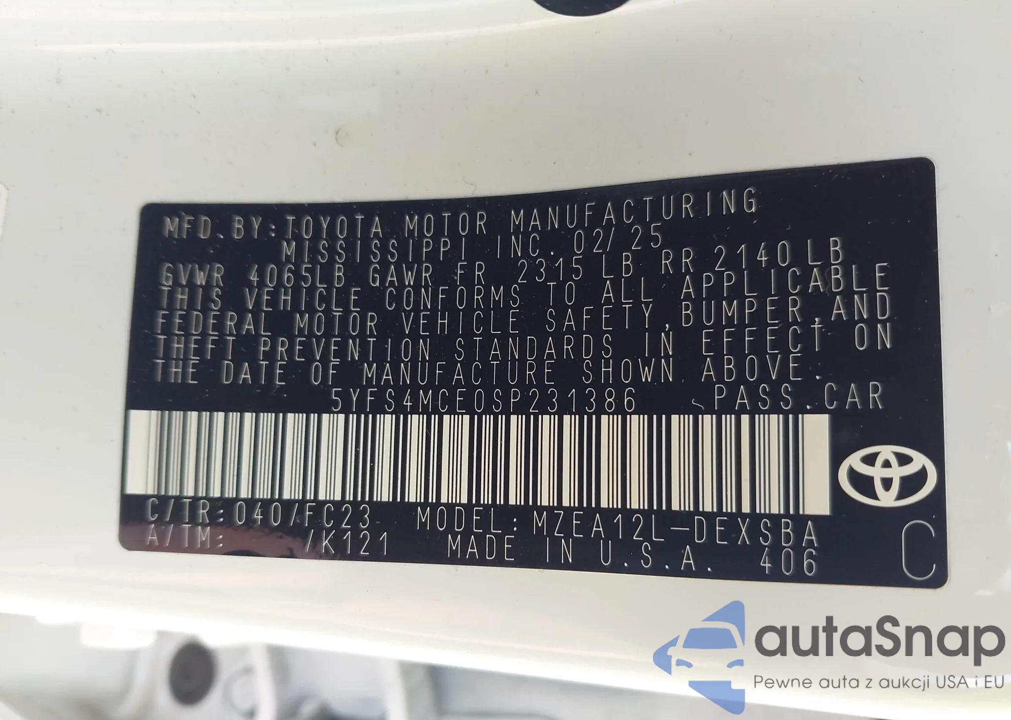LOT: 42436798 VIN: 5YFS4MCE0SP231386