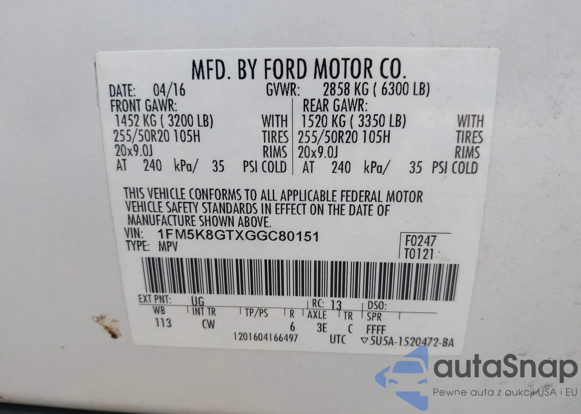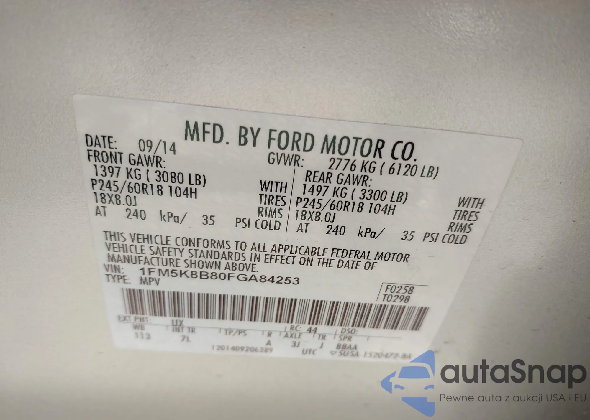 LOT: 42145433 VIN: 1FM5K8B80FGA84253