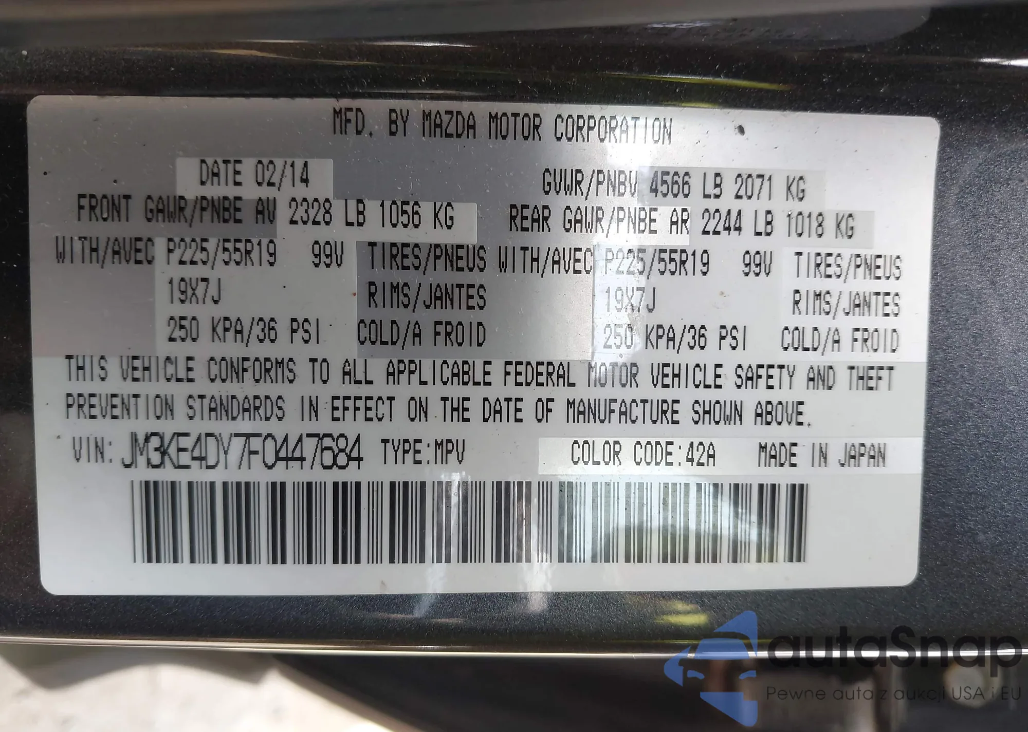 LOT: 42354378 VIN: JM3KE4DY7F0447684