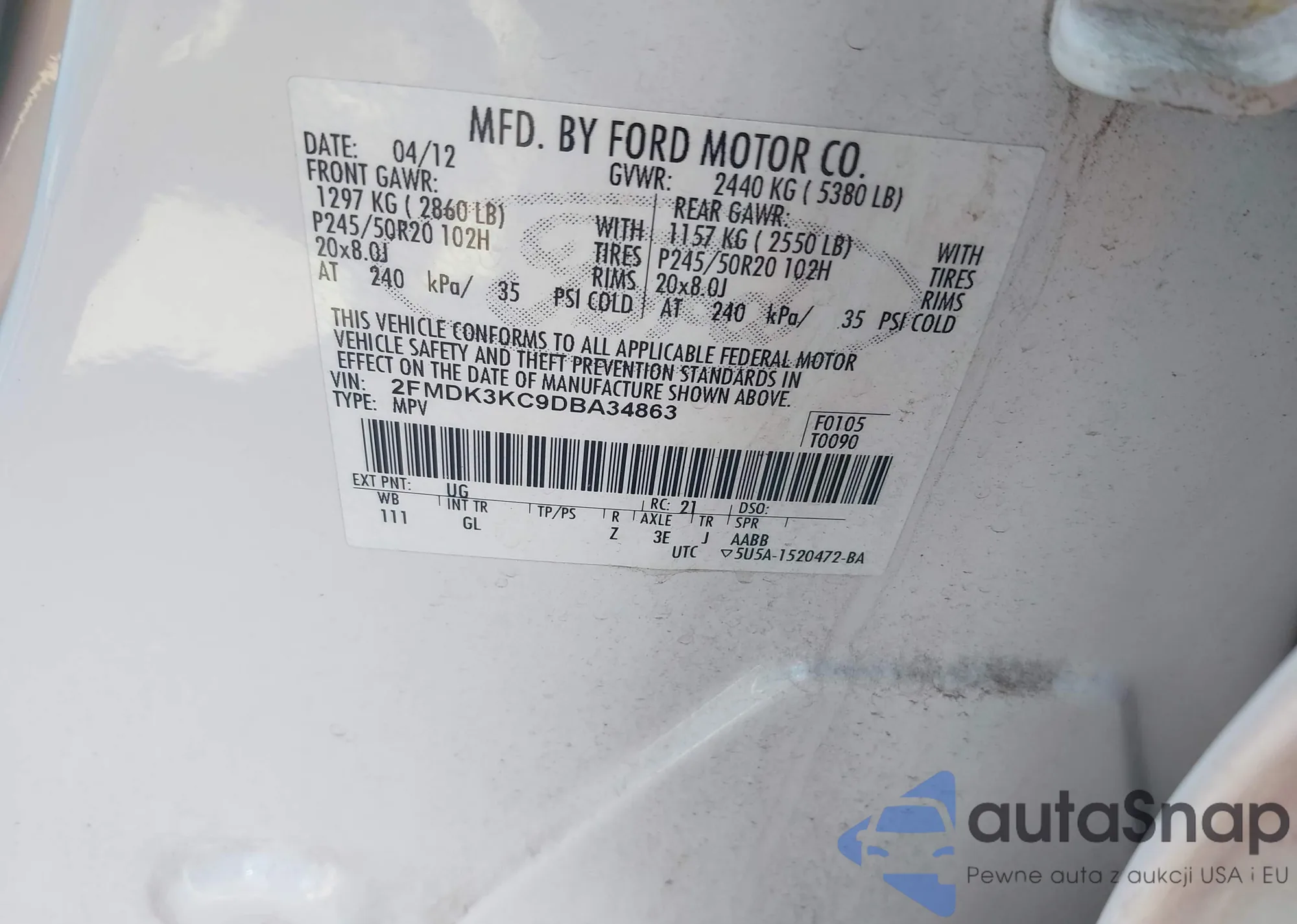• VIN 2FMDK3KC9DBA34863