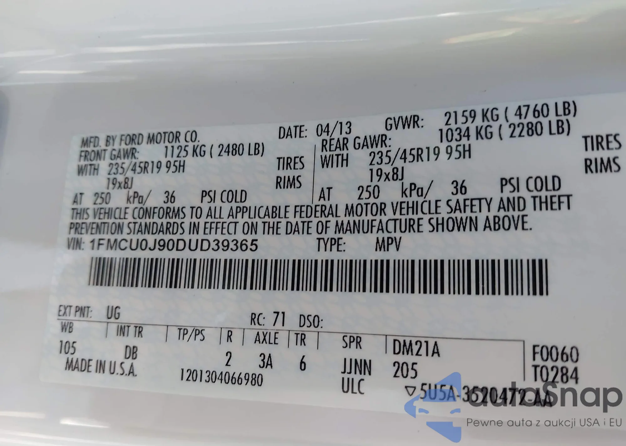 LOT: 42297163 VIN: 1FMCU0J90DUD39365