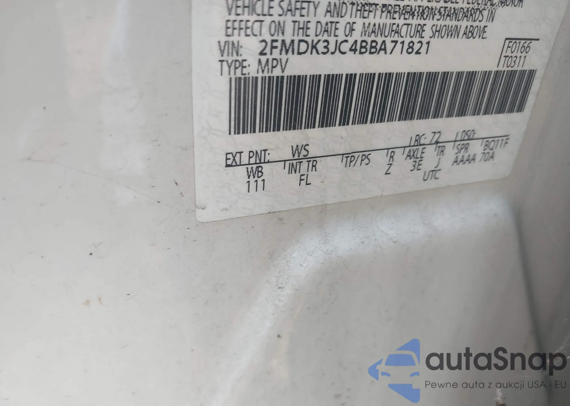 LOT: 42410585 VIN: 2FMDK3JC4BBA71821