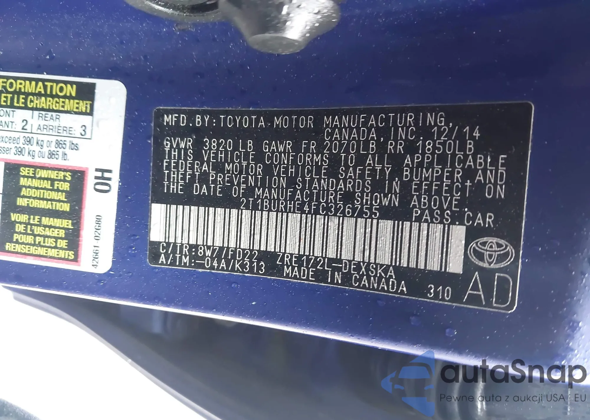 LOT: 42354296 VIN: 2T1BURHE4FC326755