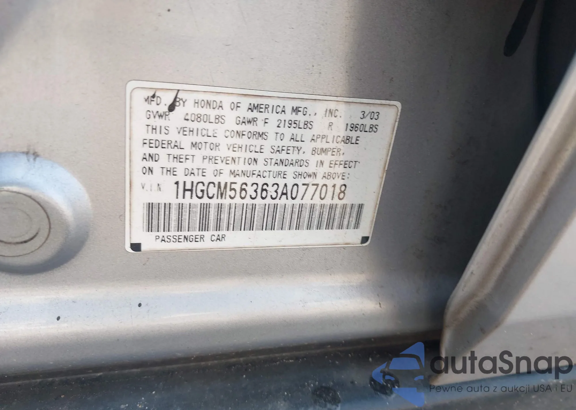 LOT: 42390361 VIN: 1HGCM56363A077018