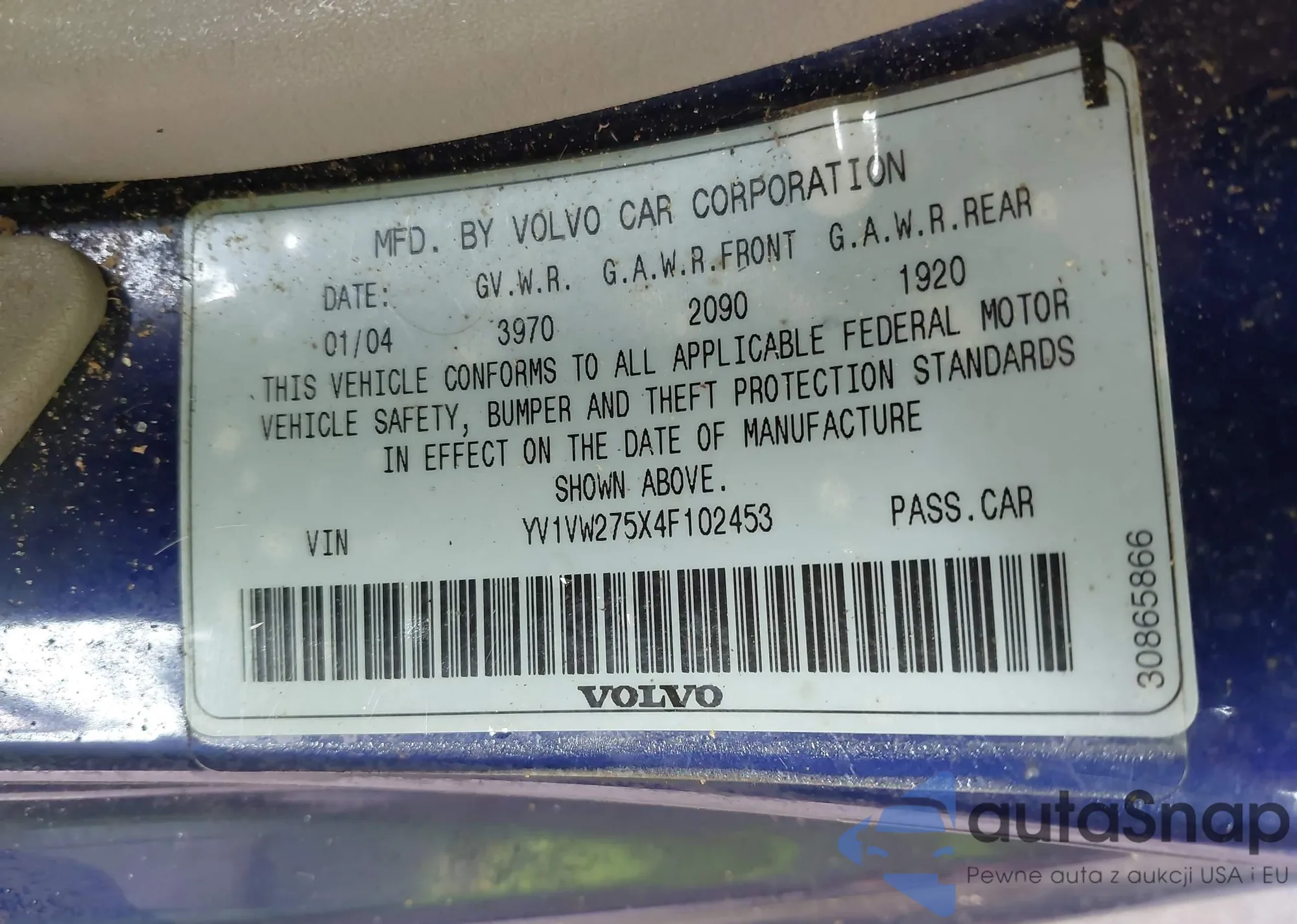 LOT: 42641804 VIN: YV1VW275X4F102453