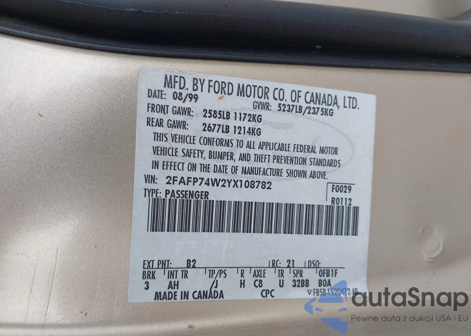 LOT: 42588052 VIN: 2FAFP74W2YX108782
