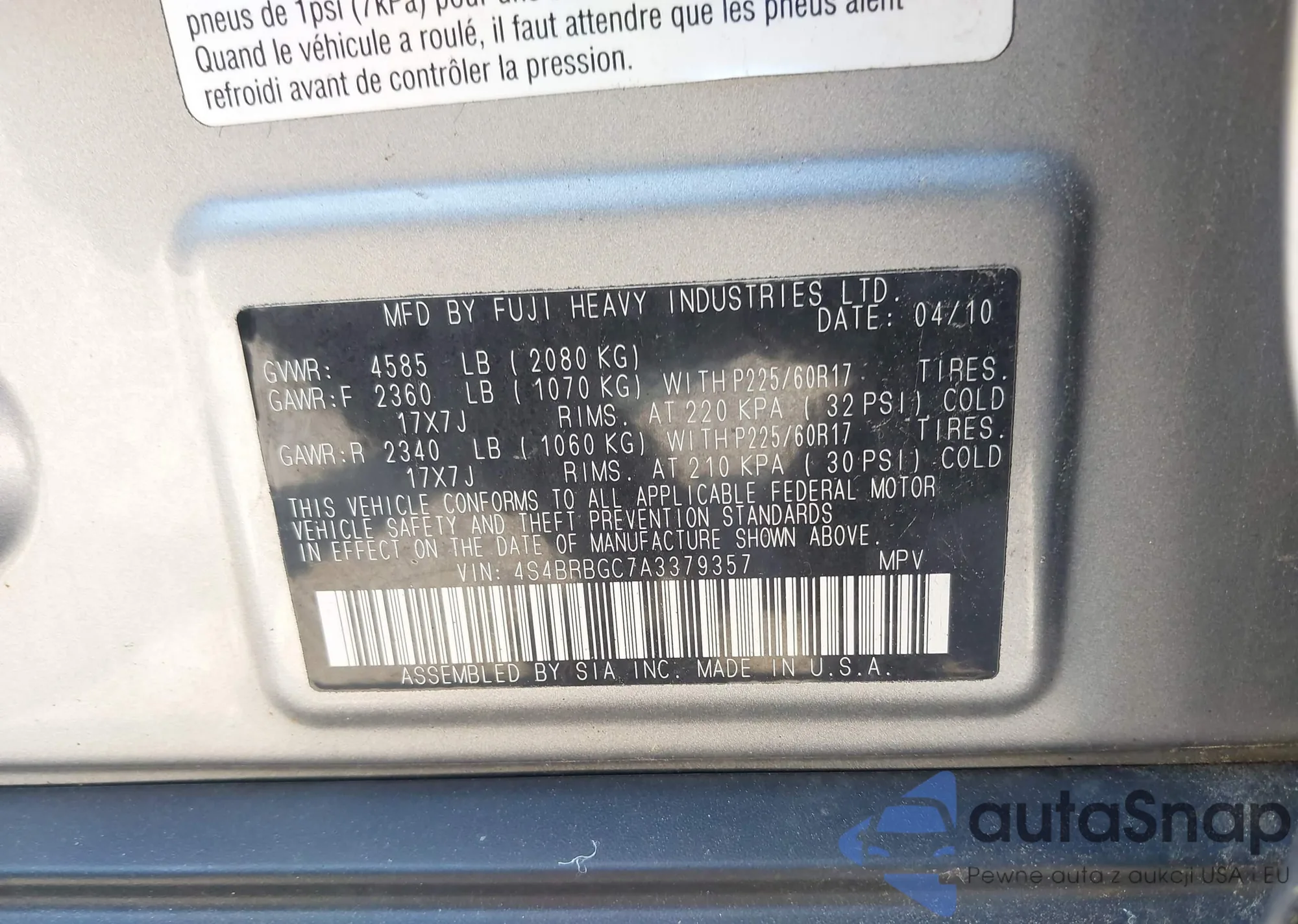 • VIN 4S4BRBGC7A3379357