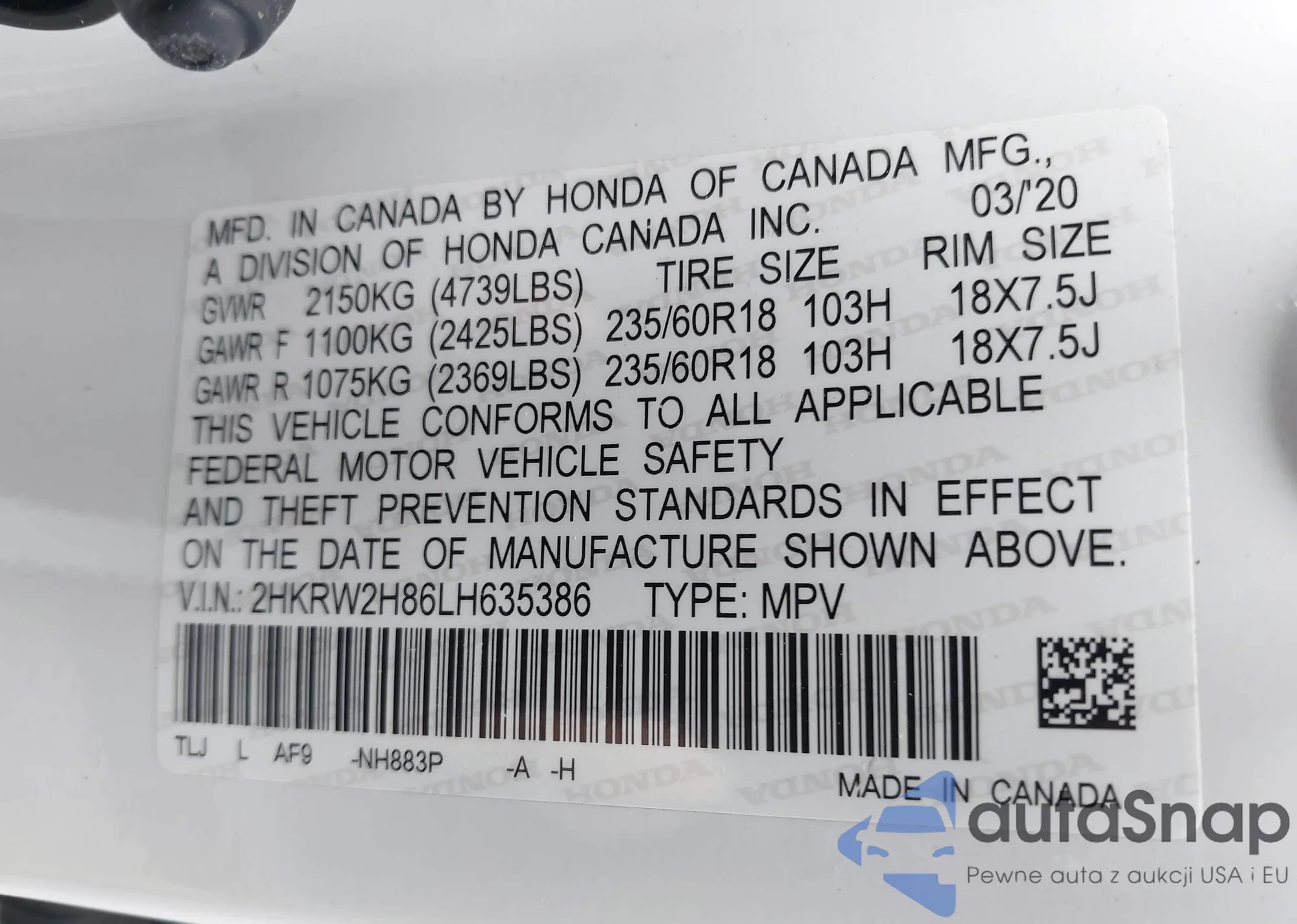 • VIN 2HKRW2H86LH635386