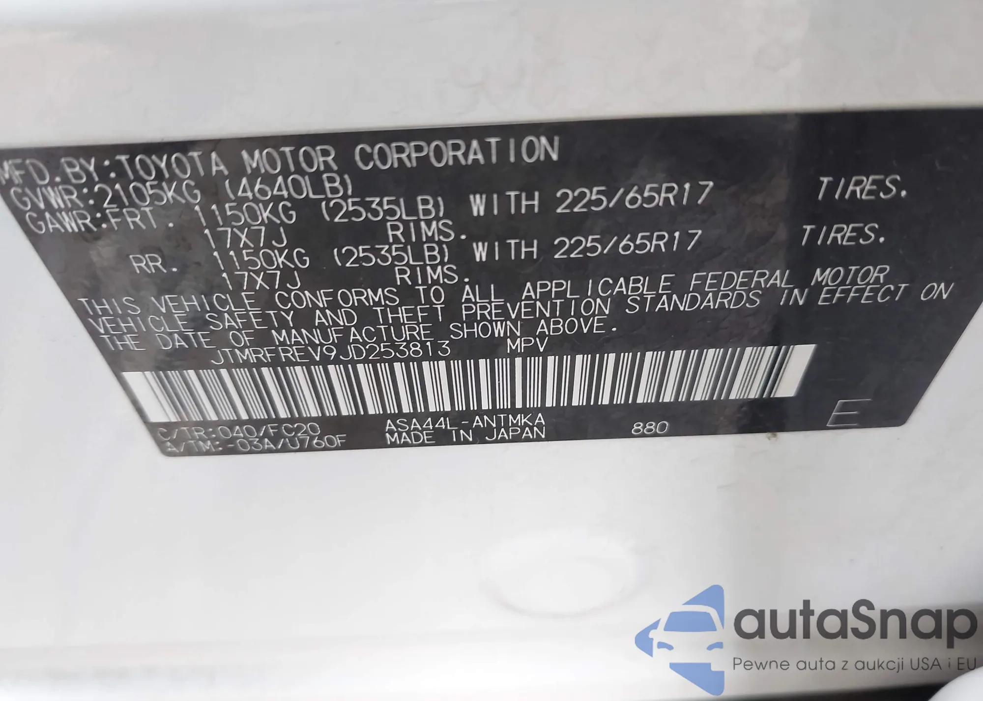 LOT: 42209576 VIN: JTMRFREV9JD253813