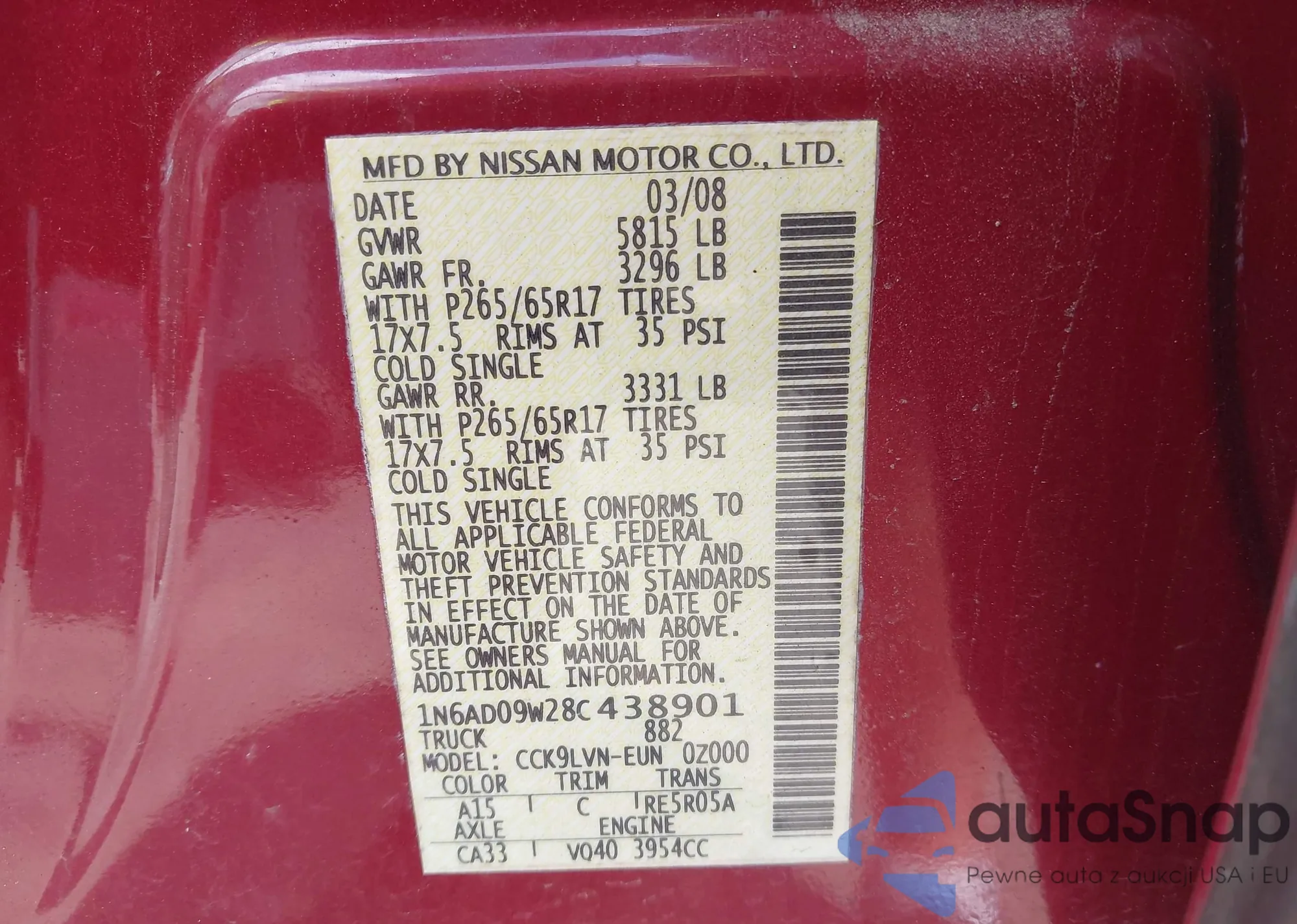 • VIN 1N6AD09W28C438901