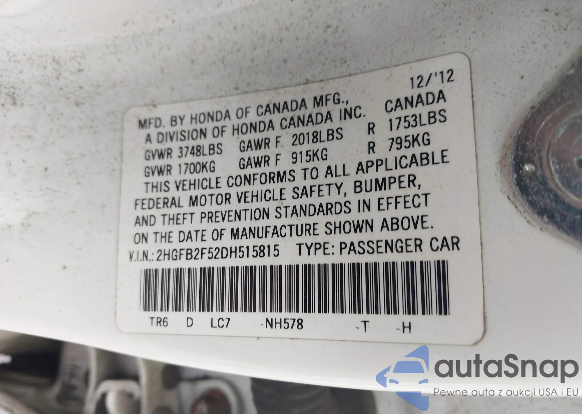LOT: 42379435 VIN: 2HGFB2F52DH515815