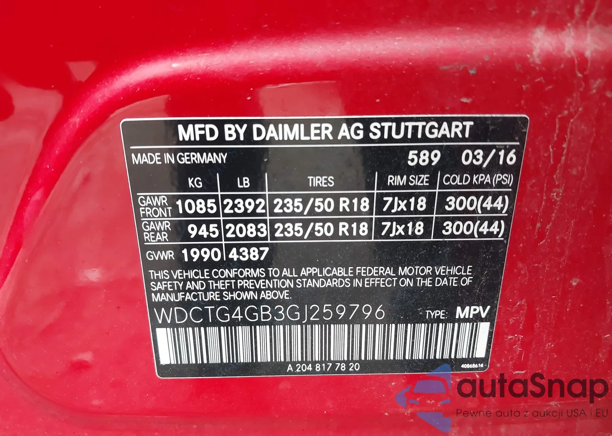 LOT: 42181417 VIN: WDCTG4GB3GJ259796