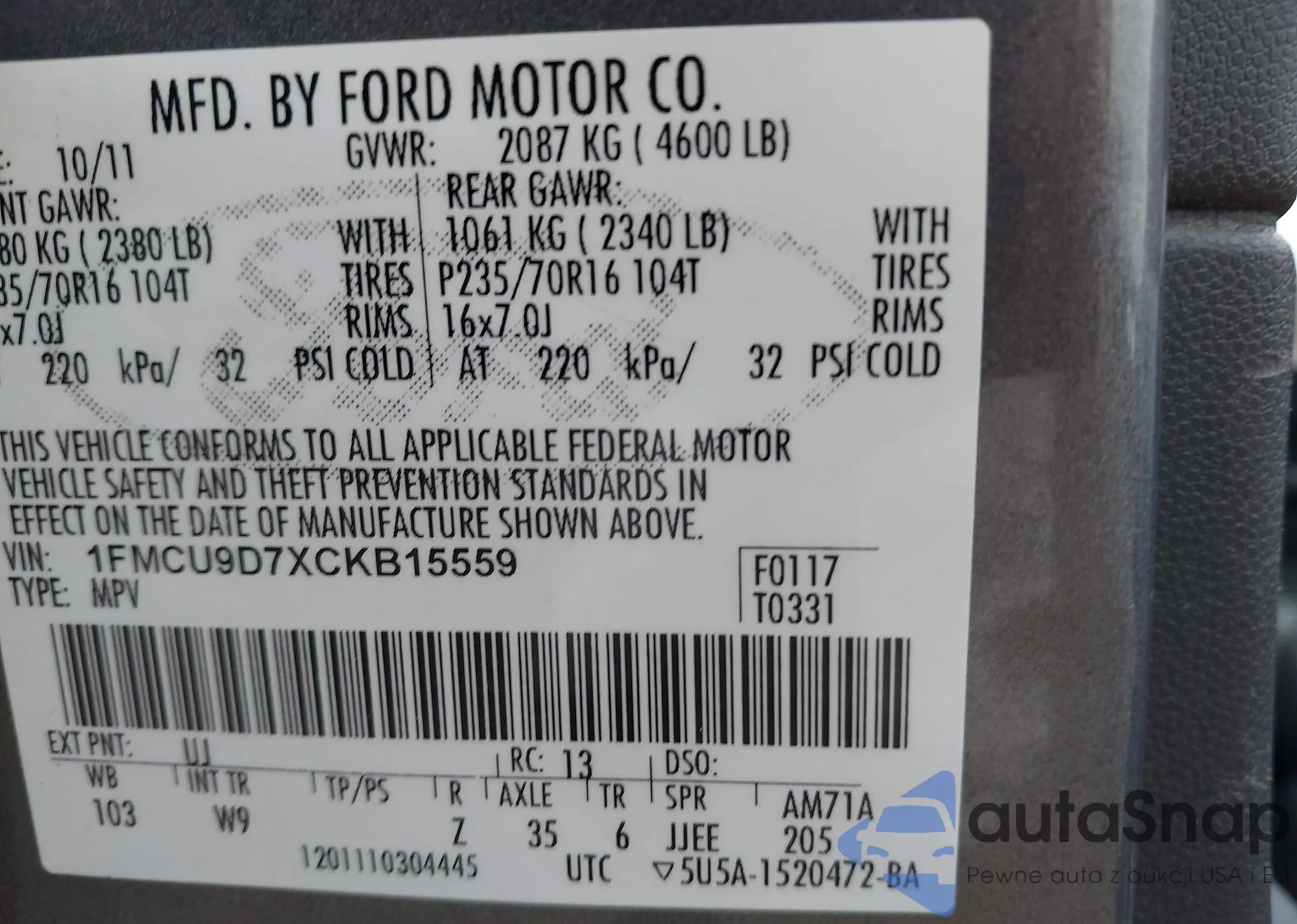 • VIN 1FMCU9D7XCKB15559
