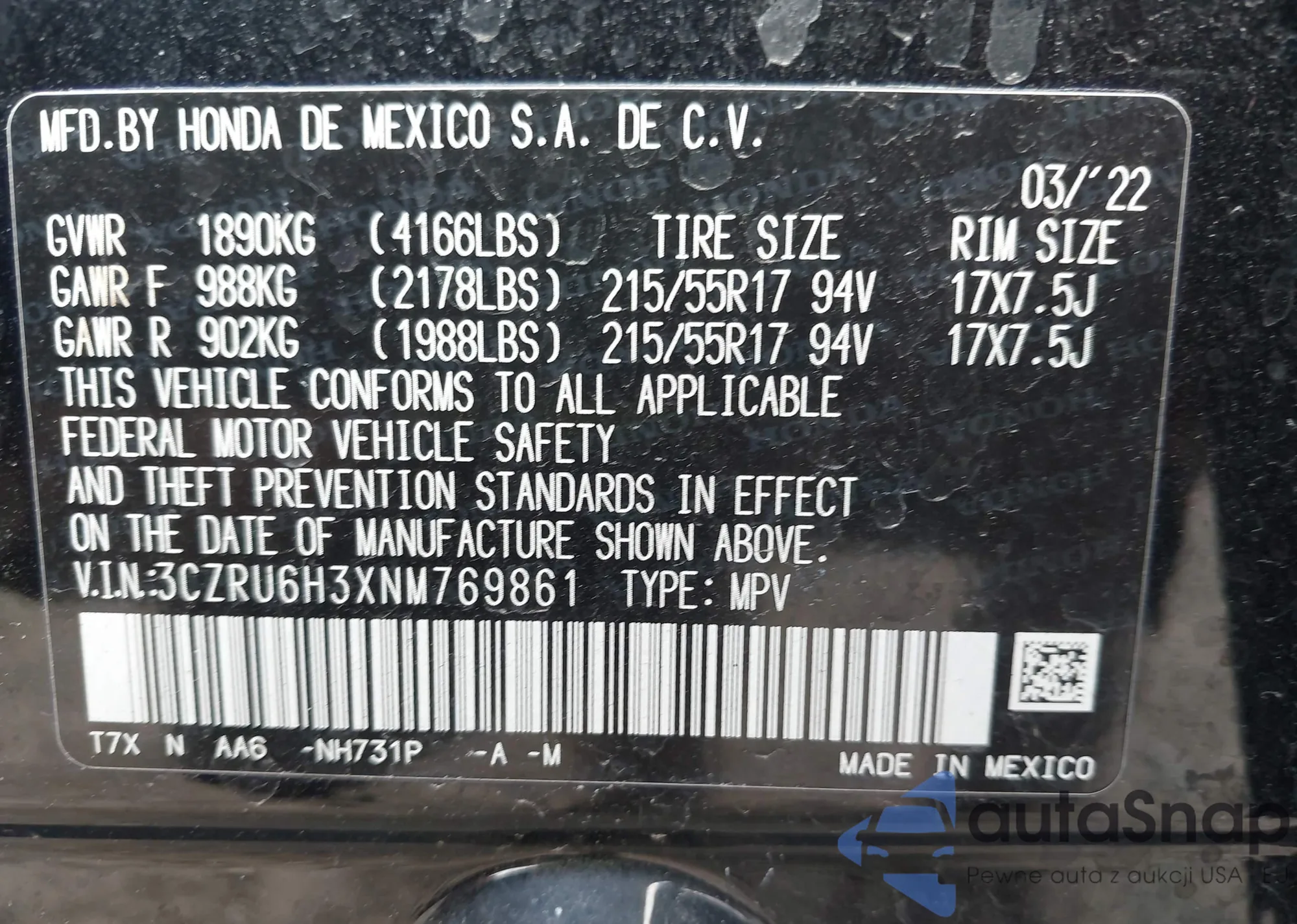 • VIN 3CZRU6H3XNM769861