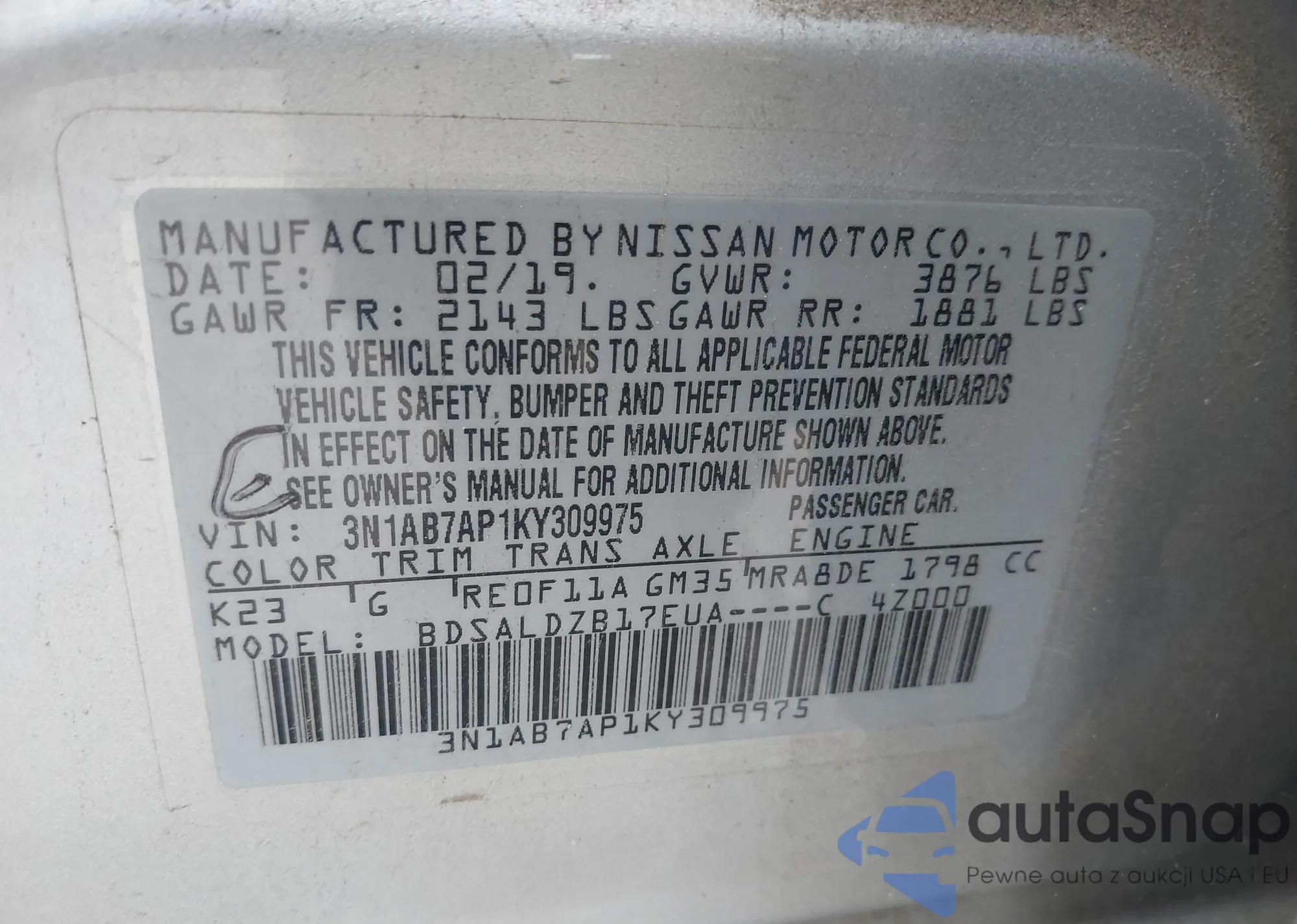 • VIN 3N1AB7AP1KY309975