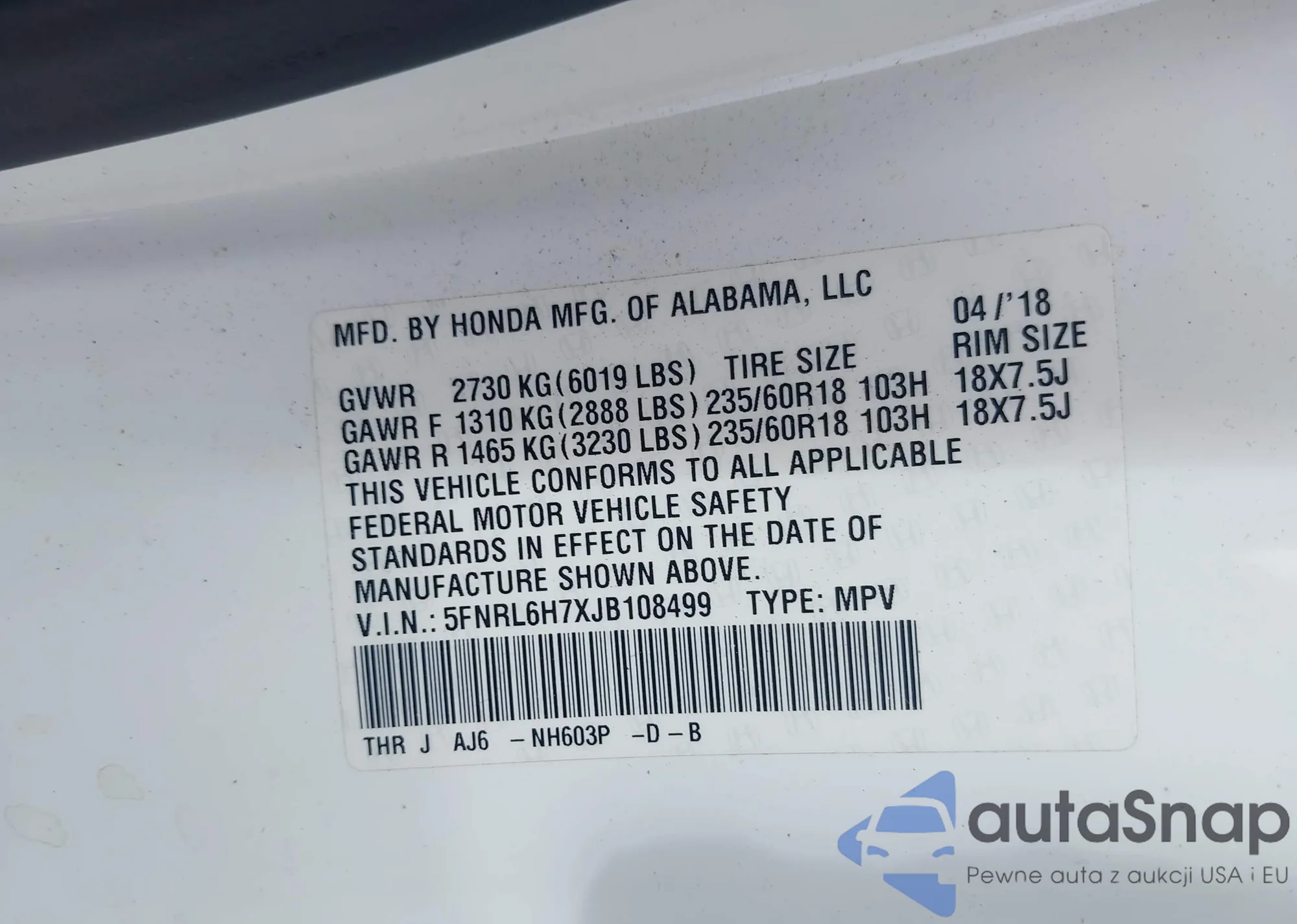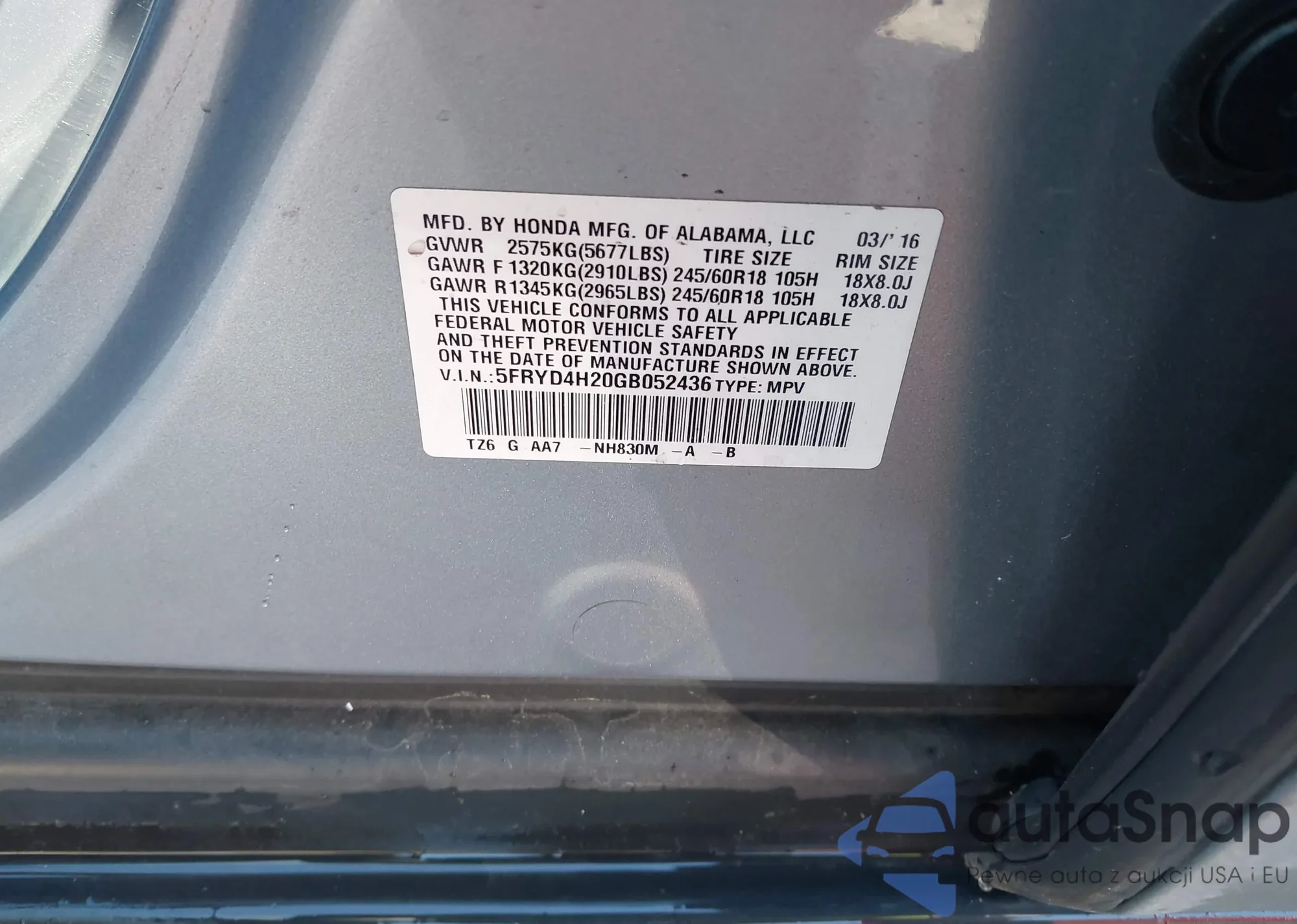 LOT: 42502408 VIN: 5FNYF6H0XHB009200