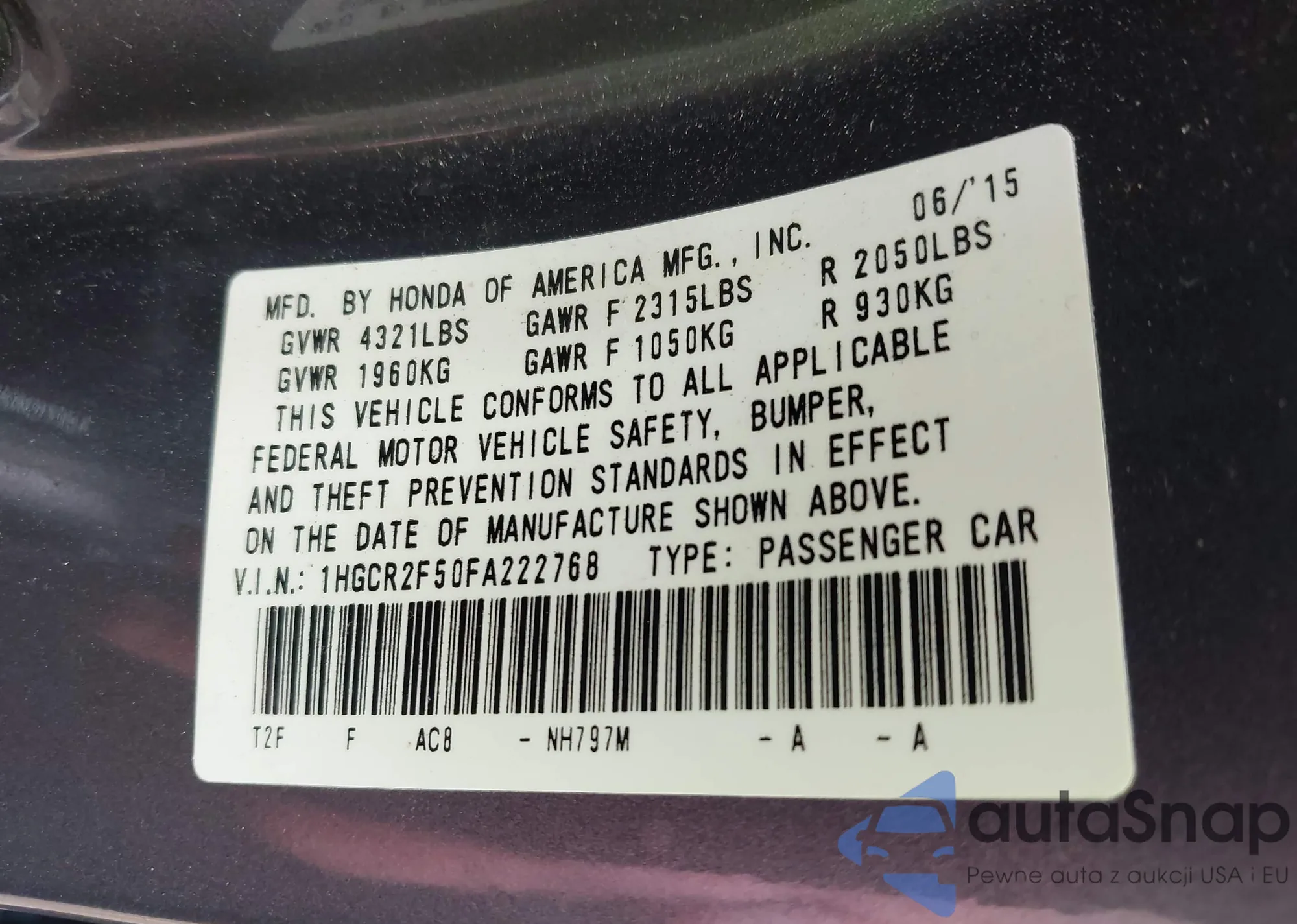 LOT: 42476421 VIN: 1HGCR2F50FA222768